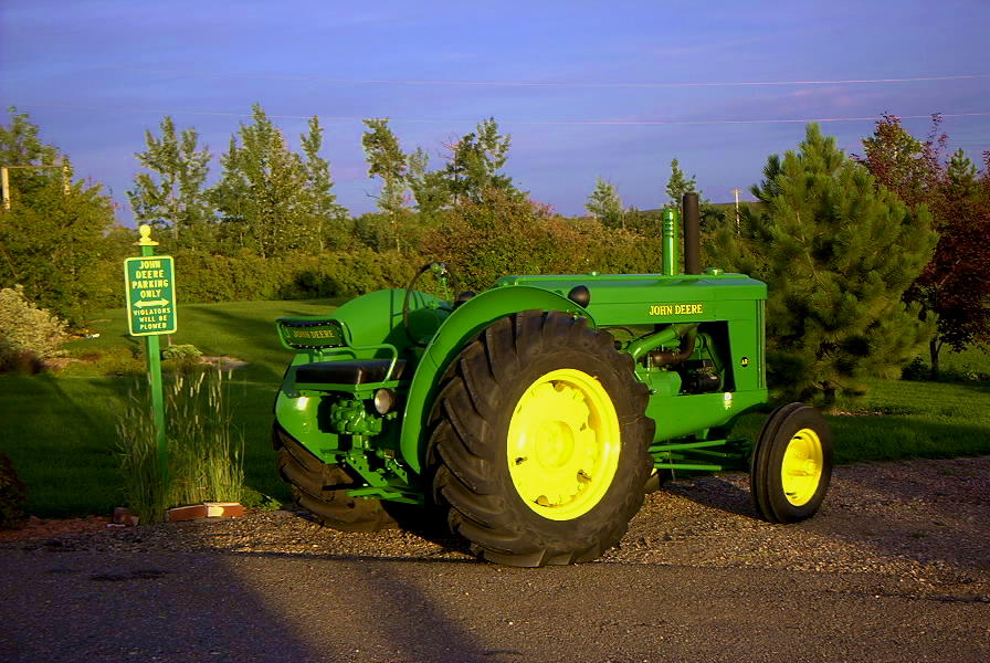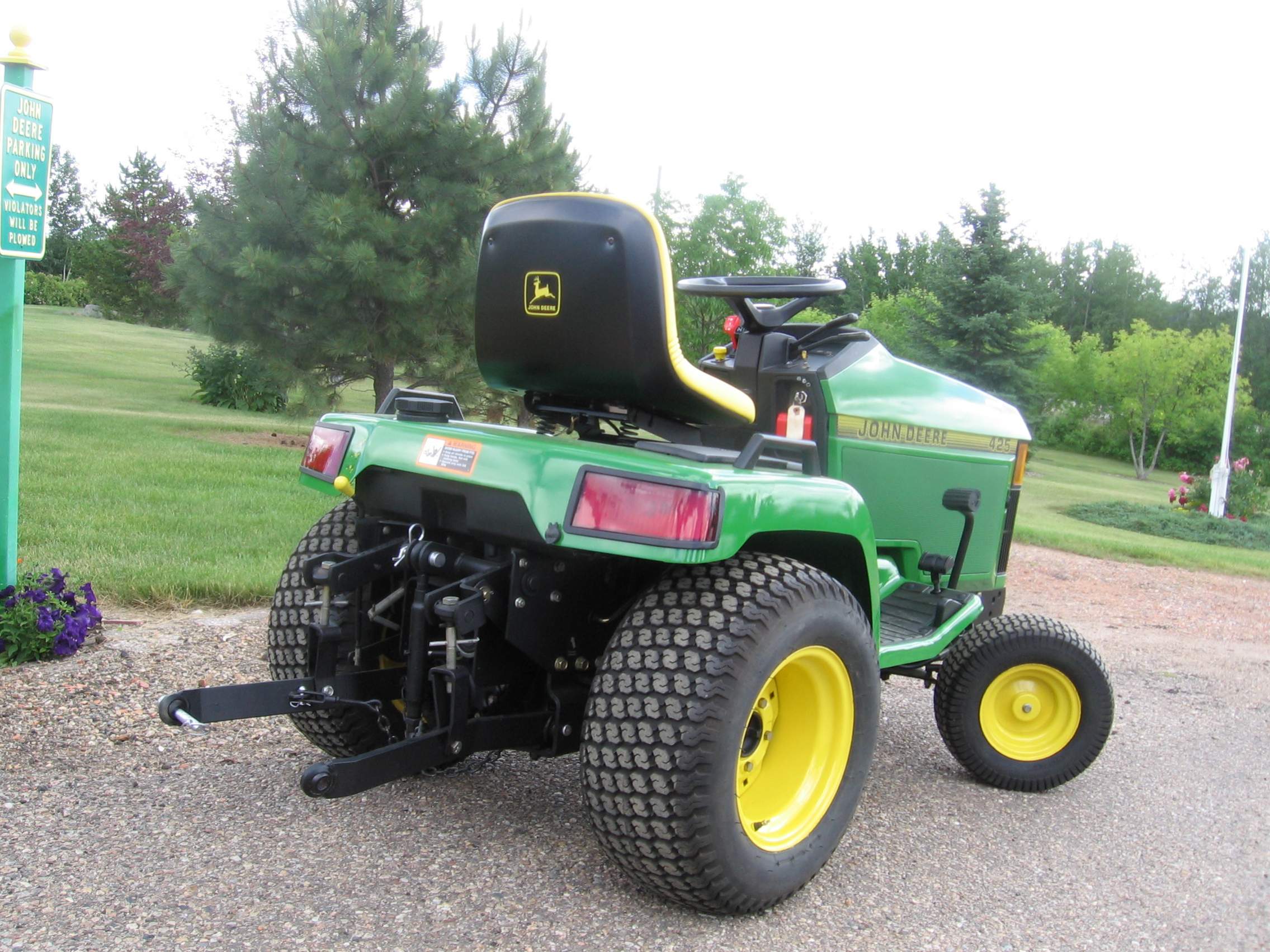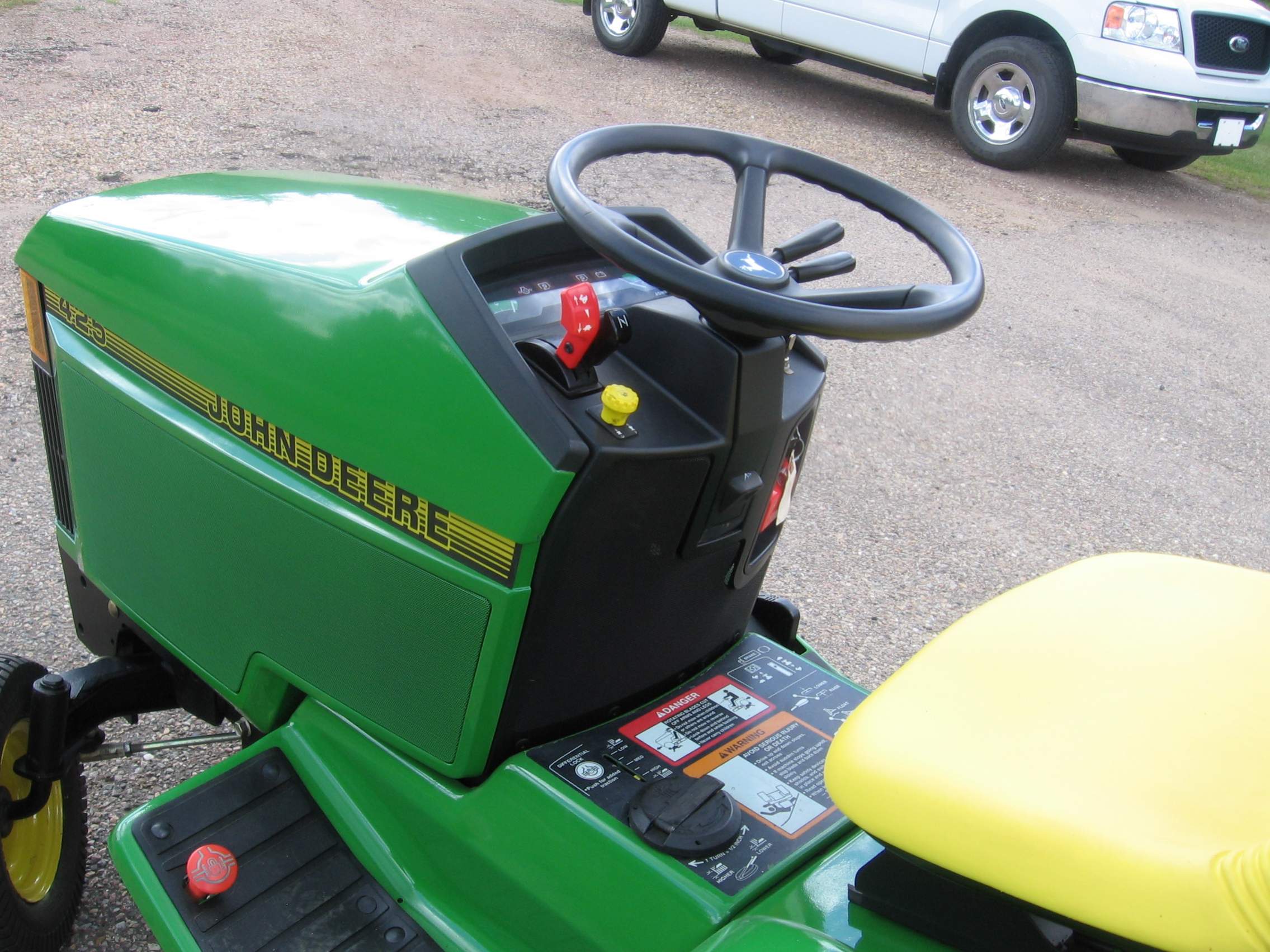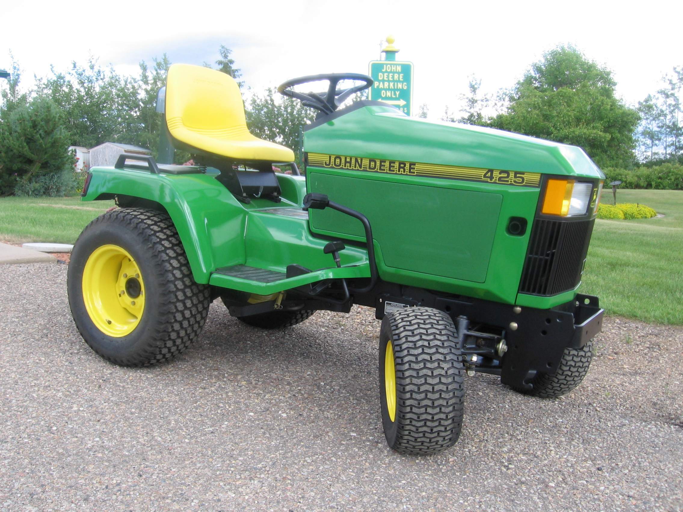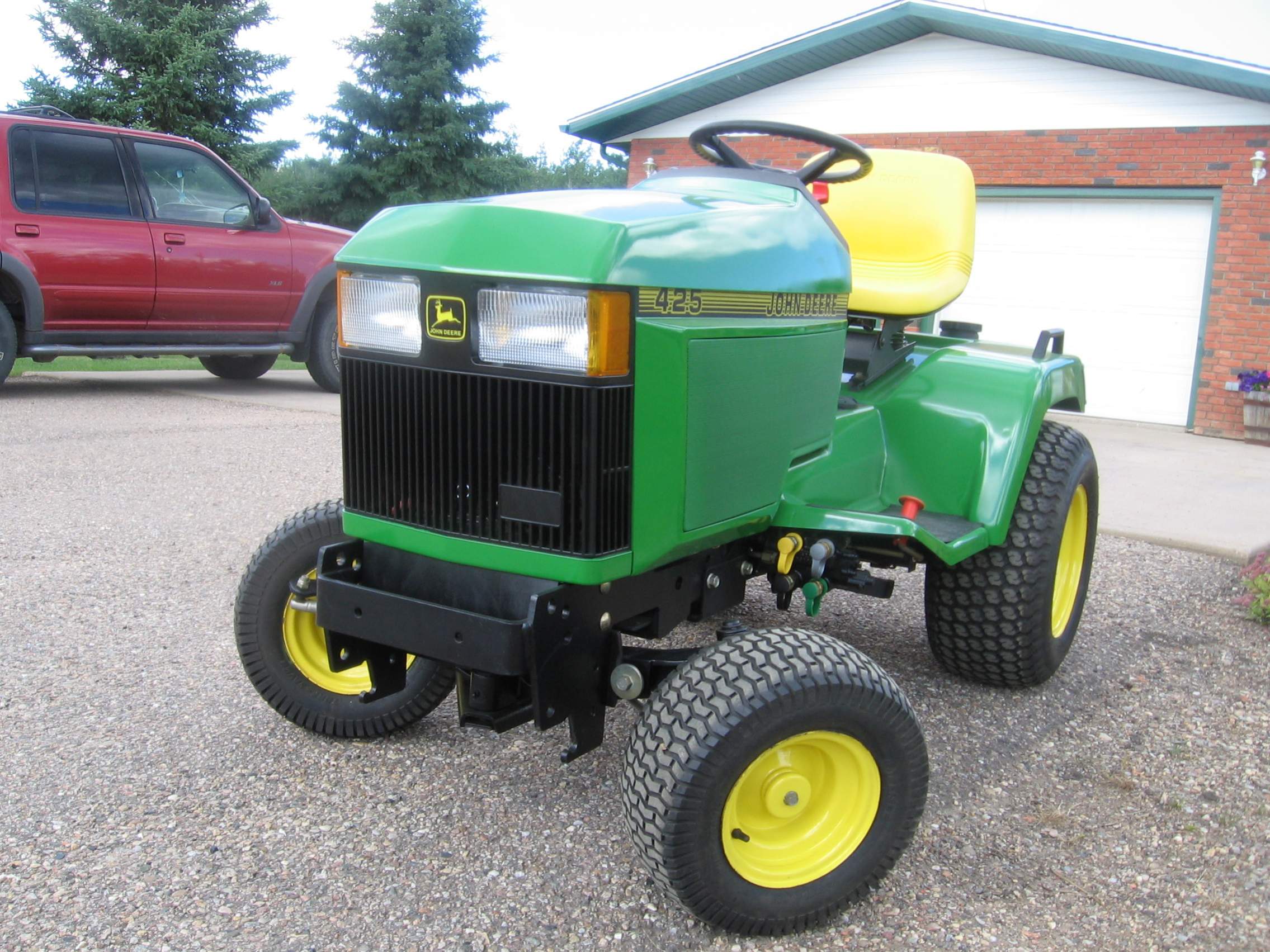 Here are some shots of a 425 that I picked up at a farm auction in June of 08. I really had no intention of buying it, but it was going very cheap, so... guess what. It is a 1993 model and had very few hours on it, I beleive the clock said 300 or so, and the underside of the deck was just like new. It was always left outdoors as the paint was faded nearly white, and was scratched up and a few cosmetic parts missing. I took it home, changed all the fluids and spark plugs, cleaned her up, gave her some fresh paint and added those few parts and a few new decals. As I mentioned before, I said my next tractor was going to be diesel so I put it up for sale asking the "going rate" for comparablr in these parts, I made $3000.00 profit on it towards what turned out be toeards my 2305.