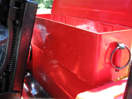 I rinsed the tractor with the hose prior to the pictures so there is water droplets all over the tractor. There is a plastic magnetic bowl to the right side of the seat in one picture; another handy holder for clips, etc. while hitching up.