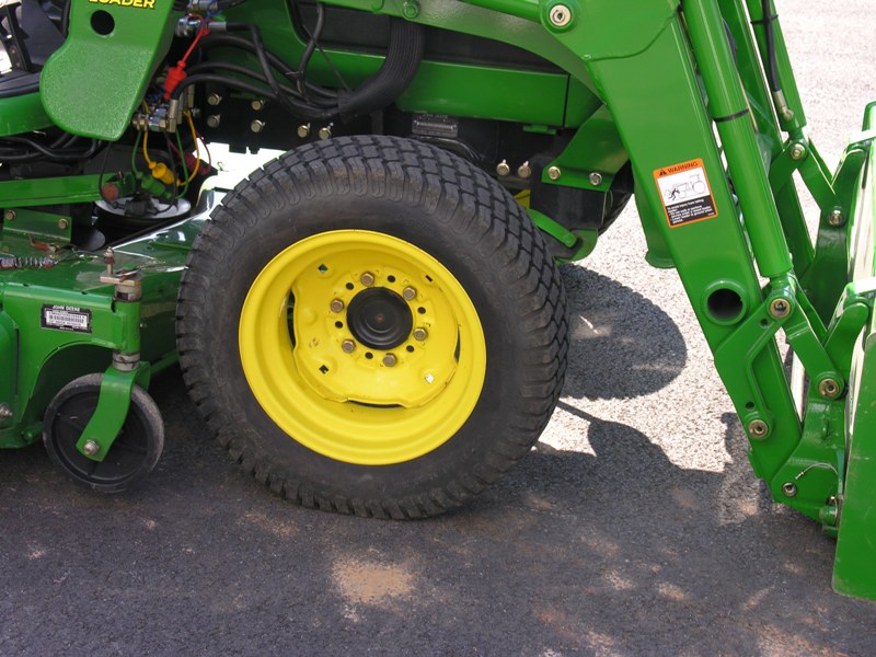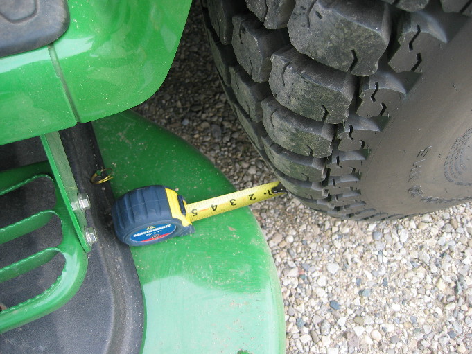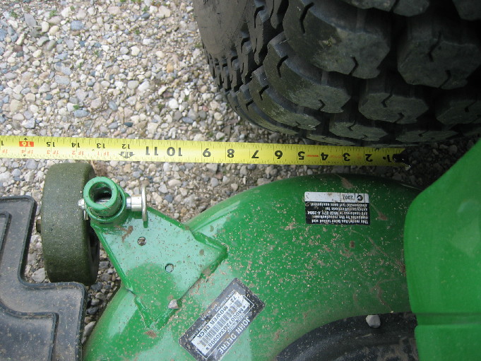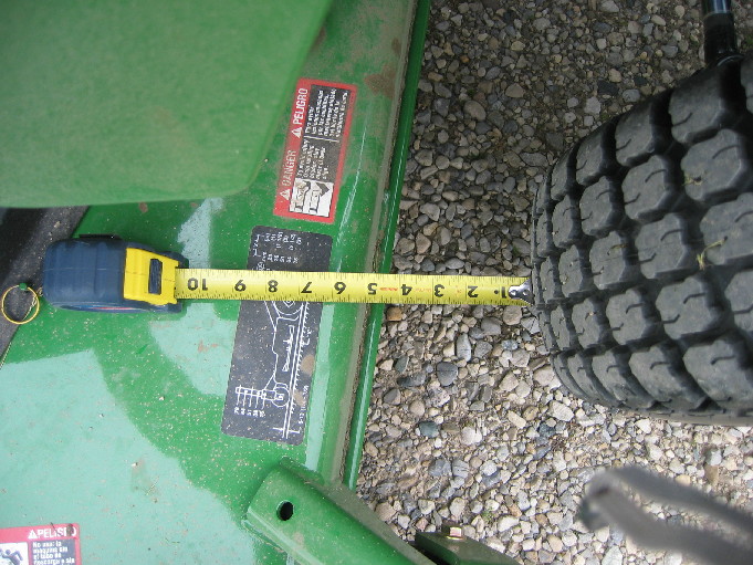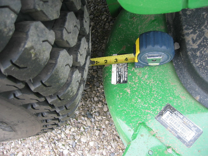 Well, Gents I need some help from all of you collective minds. I have a flail mower but with my slopes, using it to mow frequently is a bit of an issue as it does not provide the same anti-tip benefit as a 7 Iron MMM. I found a 2006 7 Iron MMM used, and I was going to pull the triggger on it, but I have an issue with the MMM on the 3520 cab with the tire i want to run. I have the small R4s but want to use my Turf Specials, which are considerably wider and provide a much more stable platform on the slopey areas of my lawn than the R4s can. I asked the dealer and they asked a JD specialist about compatibility. The JD specialist indicated that they were not compatible and I should not even try to make it work?:mad: I believe the issue is clearance of the gauge wheels and I believe that can be overcome with hub spacers at least on the rear wheels of the tractor. With regard to the front of the tractor it may be that JD does not advise using spacers as it may cause change in the weight distribution that could damage the front axle? :eek: