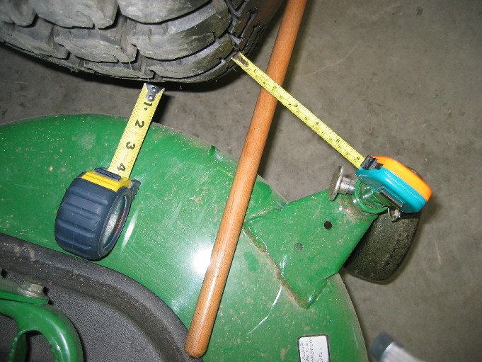 If you look at the pics you took of the mower the interference point is to the inside of the "Danger" label, an inch or two towards the middle of the deck from the weld on the mower lip. On the left side, for example the contact point is approx. 14" in from the center of the tire, measured with tire straight forward.