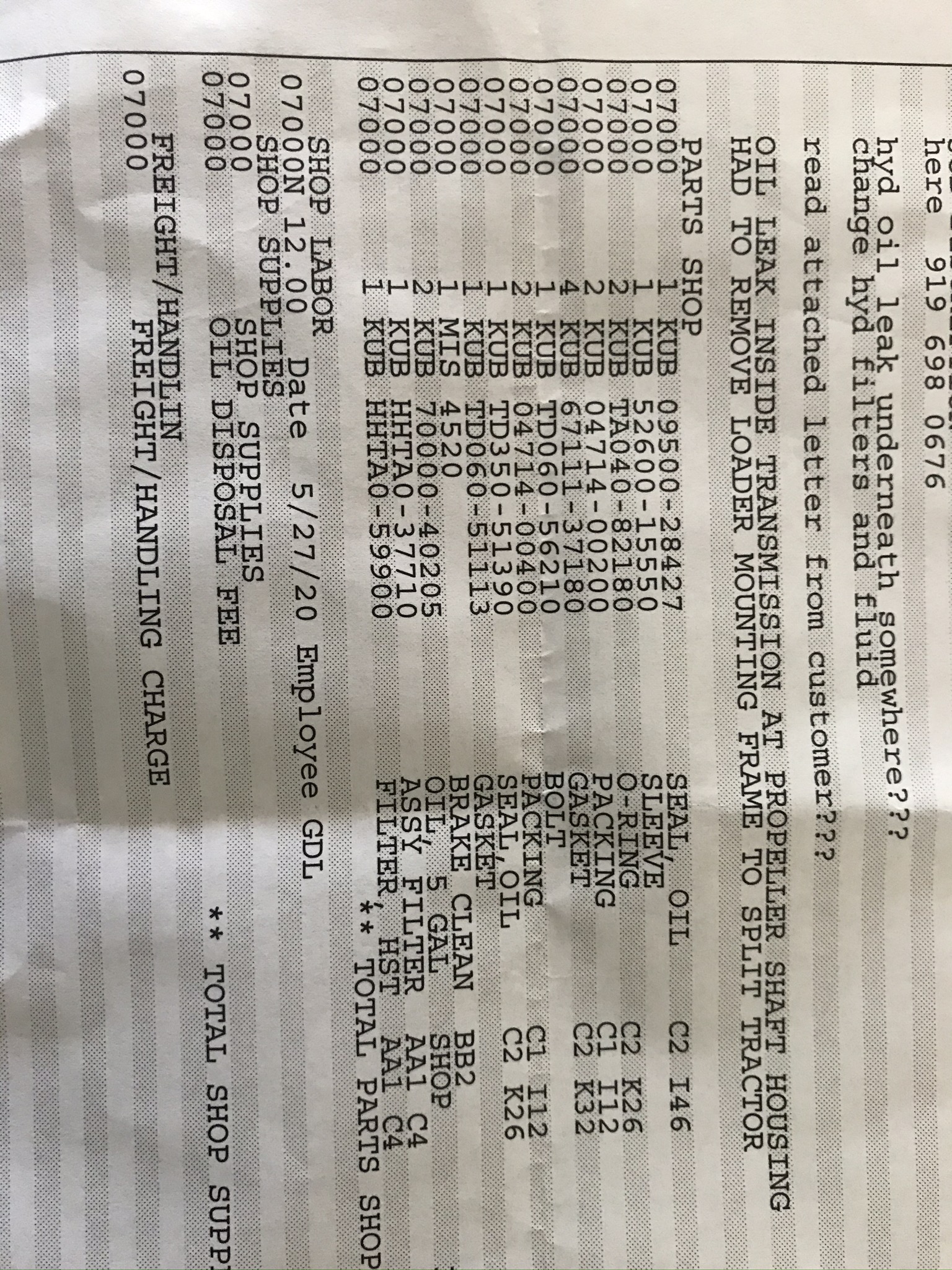 I would probably think the same, but this dealer's workshop isn't about to dive into my tractor to drive up their workload for shop income. They have plenty of valid work to do, to include new tractor sales prep. They move a lot of equipment. I'll relay exactly what they replaced on the invoice when I get it back. I want to make sure I'm correctly explaining what seal they are replacing. I'm just hoping this fix will last longer then the 375 hrs this one lasted.