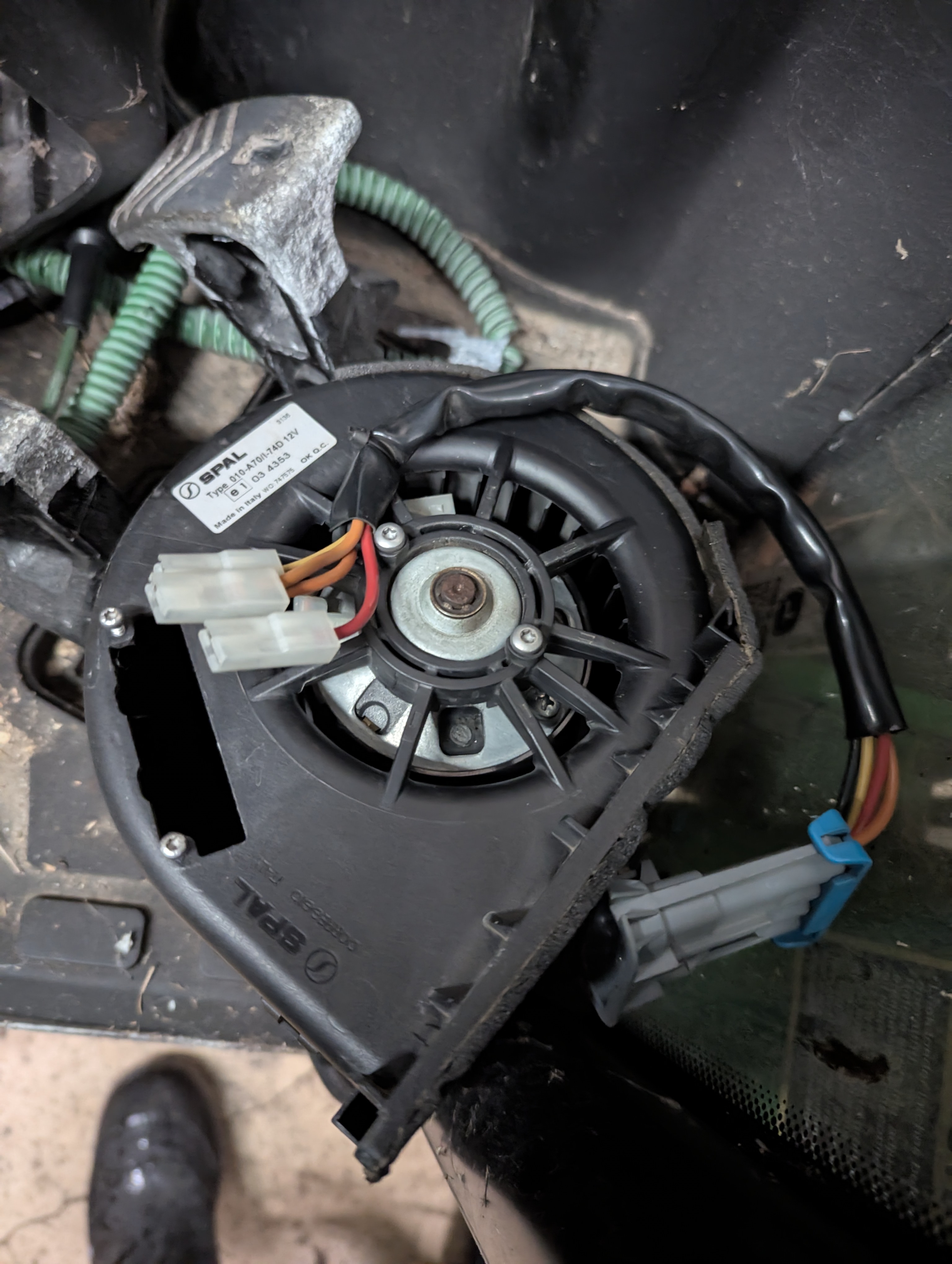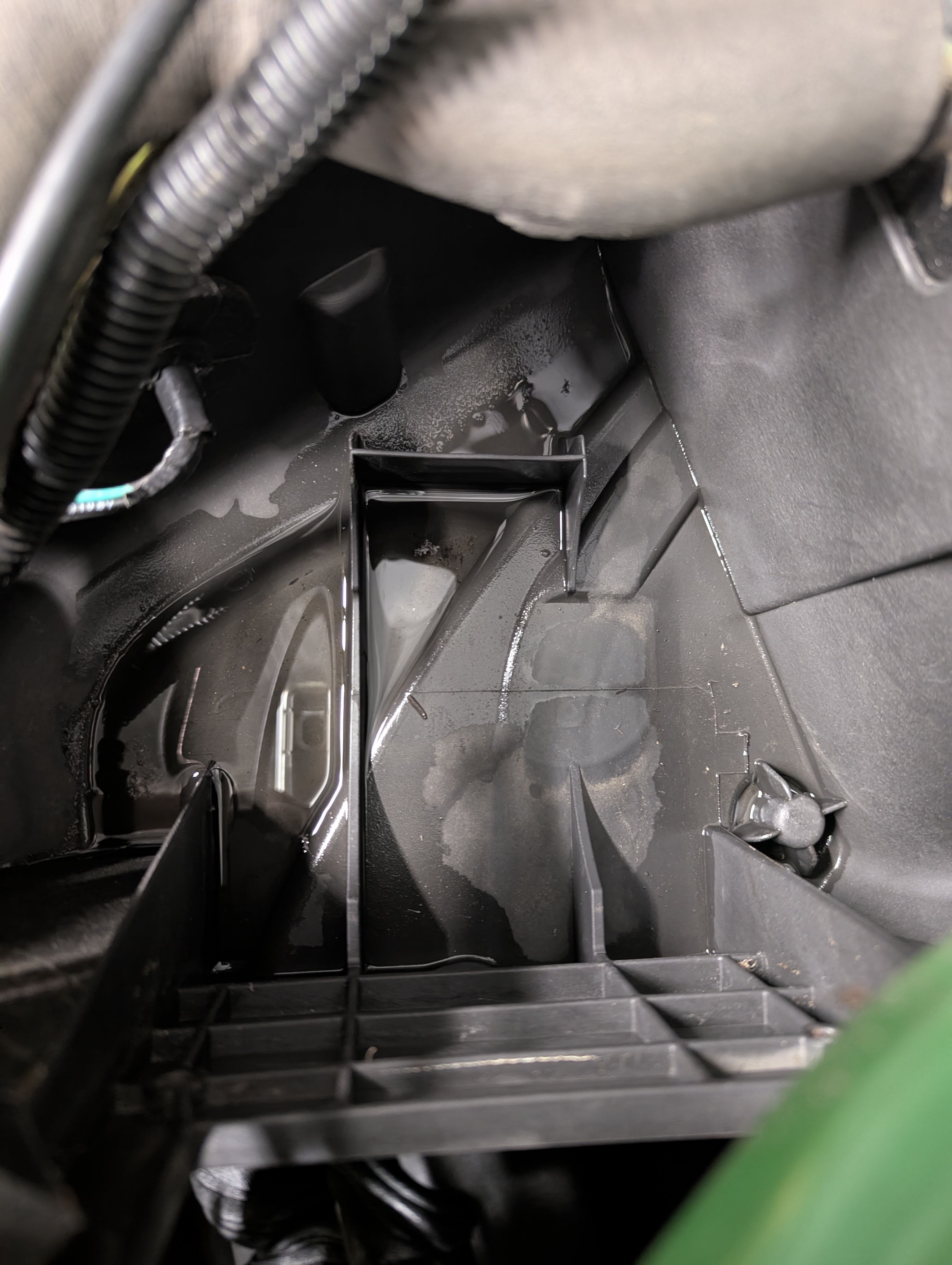 Water collects in the tray under left and right blowers. It freezes and blows the resistor in the heater housing you are lucky, if you are unlucky it burns out the fan motor. John Deere only sells the complete blower fan with the resistor. Expensive! BUT the resistor is available separately from Bobcat. I'm going to upload a few pictures in the hope of helping others save on the repair. In one of the pictures you can see some pooled water. It gets to be about 3/4" deep then when the temperature drops it freezes the fan cage and that is what burns out everything. I plan on drilling a couple of holes through the base tray I know the water will drop on the glass in the summer with the AC on.
