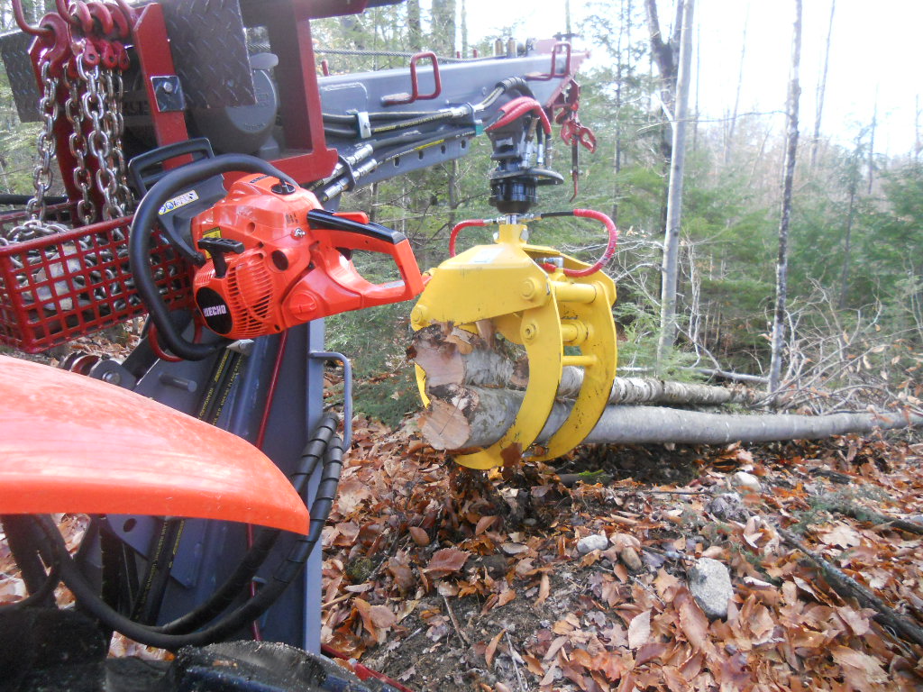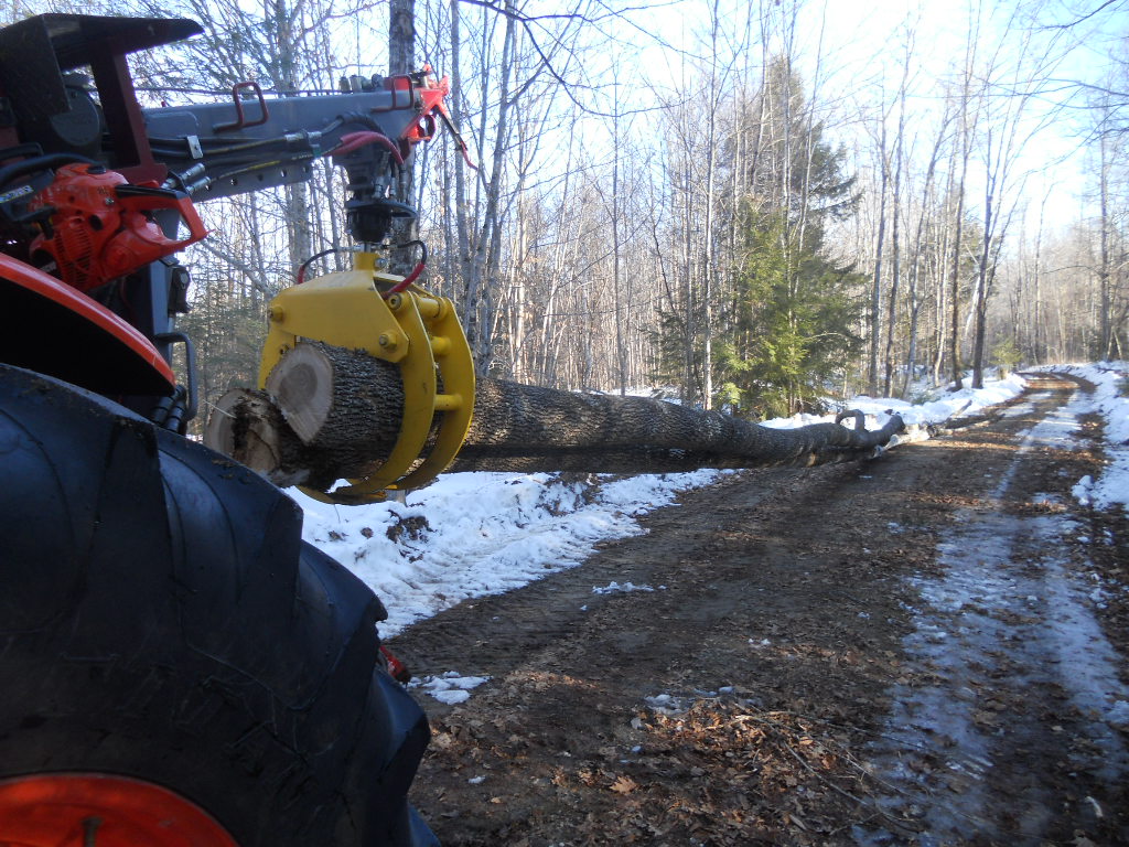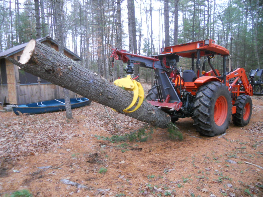 I don't have any videos but a winch is a winch, the grapple is the fun part. I have 711 ac. of woods with a couple of miles of various degree (condition) of roads. I don't like to drag on the better roads unless it's frozen. The grapple and the way the winch is built allow me to have the butt end in the air 'bout 4-6' depending on if it's in grapple or on the chokers, saving my roads. Depending on the log, I can haul it off the ground completely. Big one's need to be shorter, but smaller one's can be 30' long. That big pine log needed to come down, it was hit by lightning and I didn't want the wood to go to waste, but all of my regular cutting is just thinning for firewood. No big "sticks" like Rob hauls. DSCN7667.JPGDSCN7795.JPG