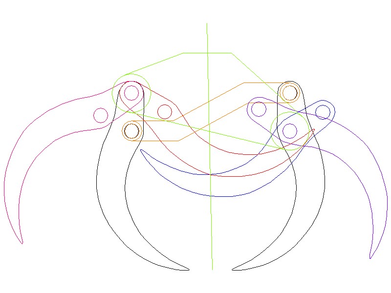 With the "Rusty grapple", both sides of the grapple are identical and the motion of the linkages perfectly suits an 8" hyd cyl. The downside is I don't care for how it closes (at least in my drawing) and isn't nearly as compact when fully closed. This one should have more clamping force available as the cyl & cross link mount are further from the pivot pins