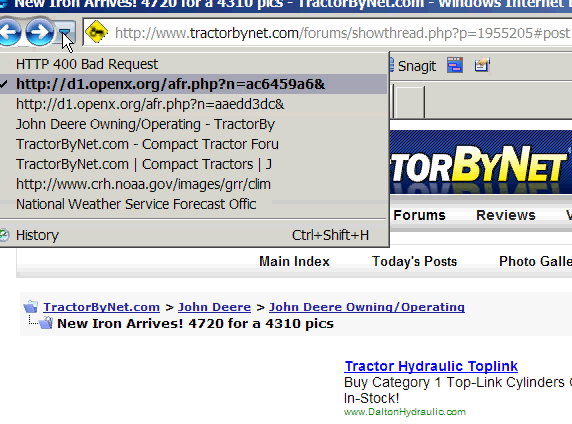 Opened my browser today (Windows Vista and Firefox V3.6.4), cleared all history, cookies, temp internet files etc. Downloaded and installed latest version of Java and Mozilla Firefox plug ins. Logged into TBN and started reading threads. Still getting 400 Bad Request msg. Not on all threads just some of them. I am still able to read threads, reply to, etc.