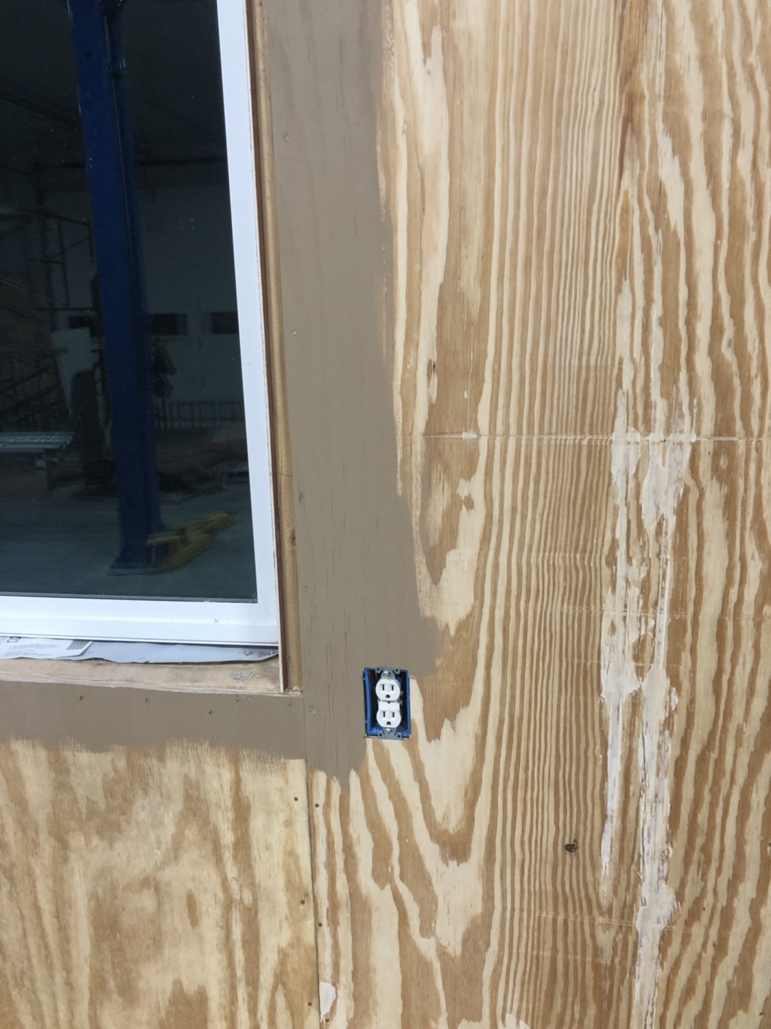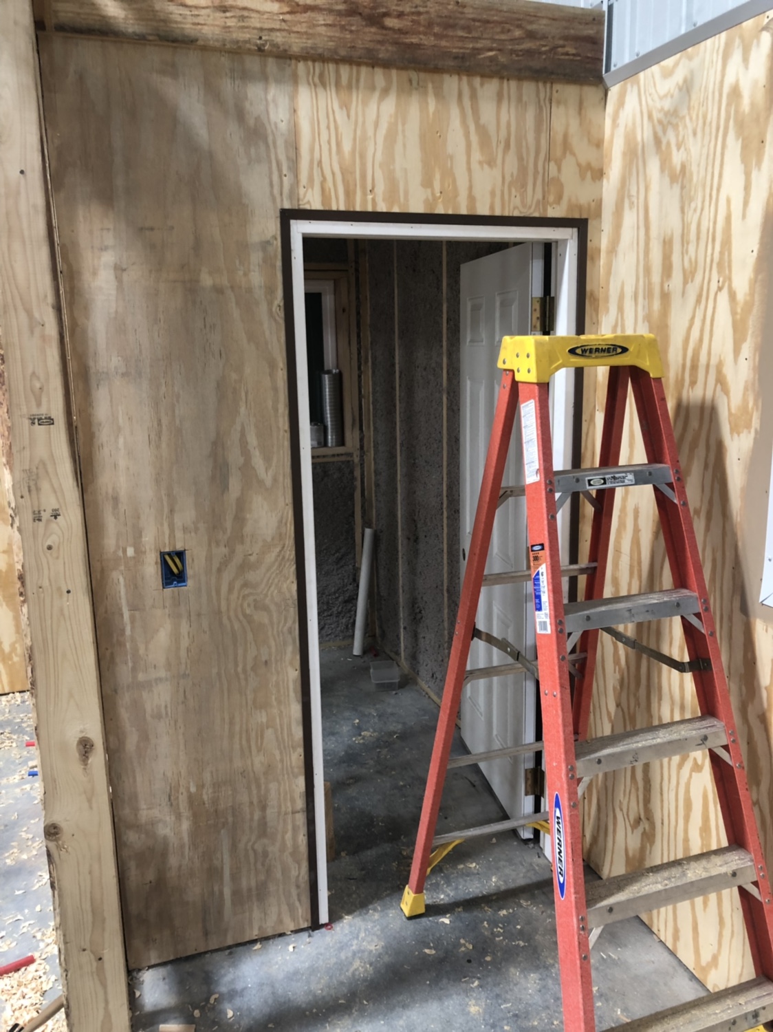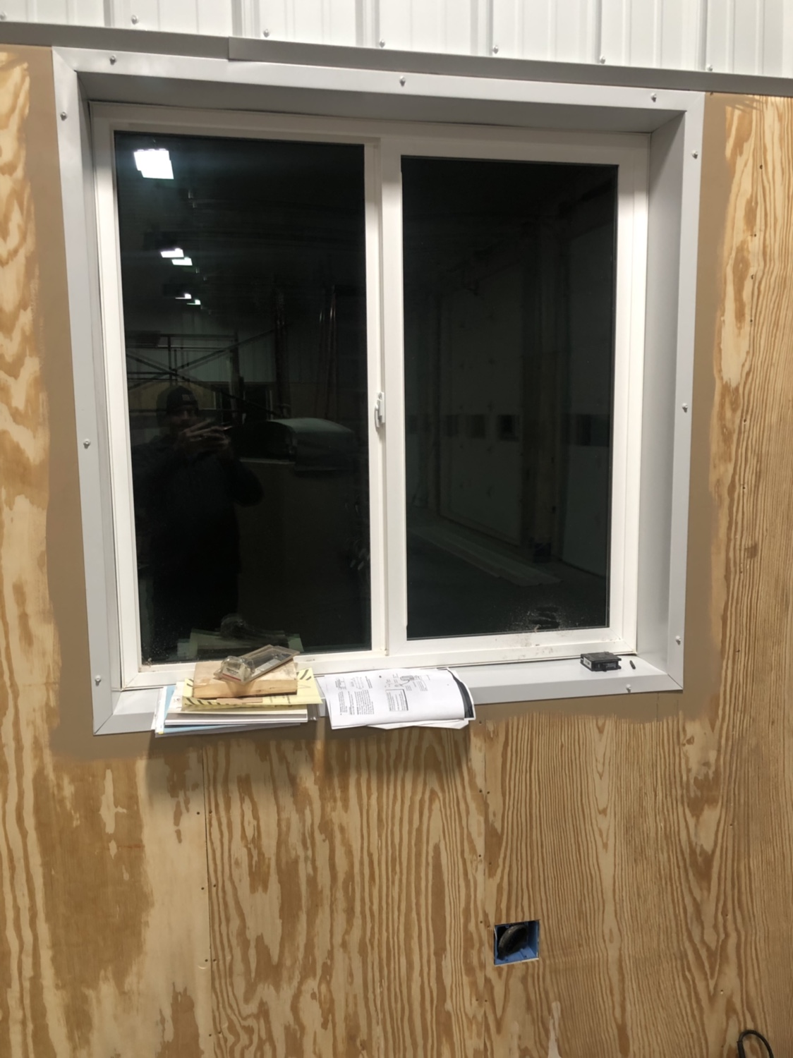 Couple of the windows trimmed in white metal. Oddly, he trimmed the doors in brown. You can see the color that we are going to paint the plywood in this pic too.