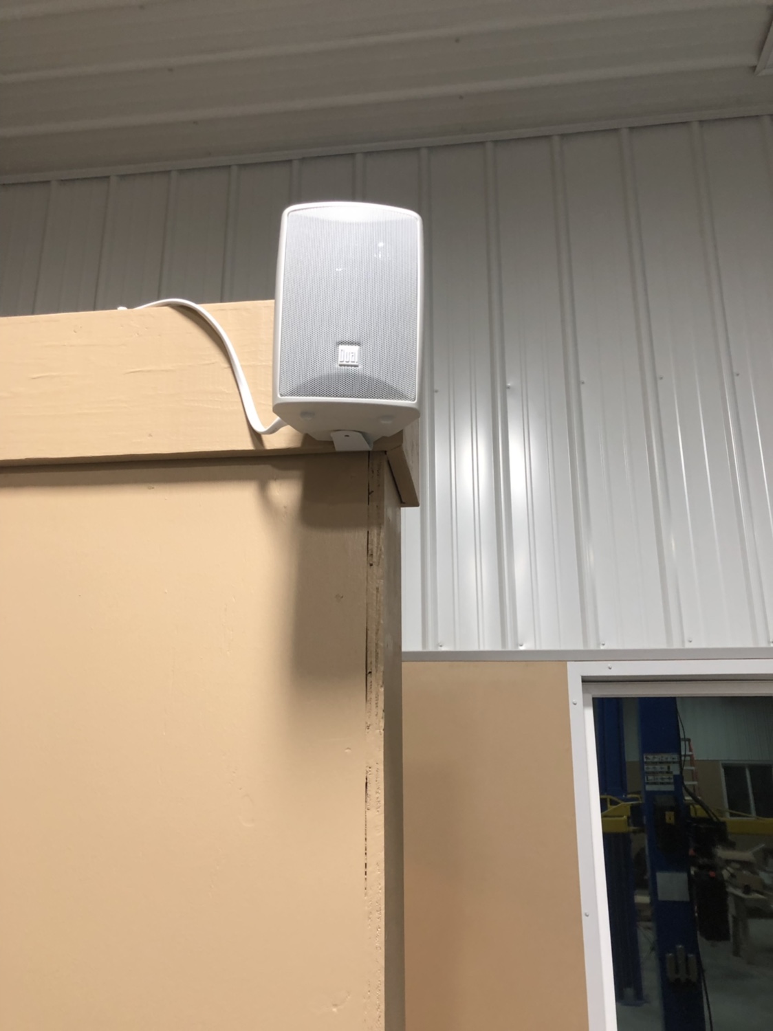 One of these in each corner of the shop. Works, not super loud but provides music.