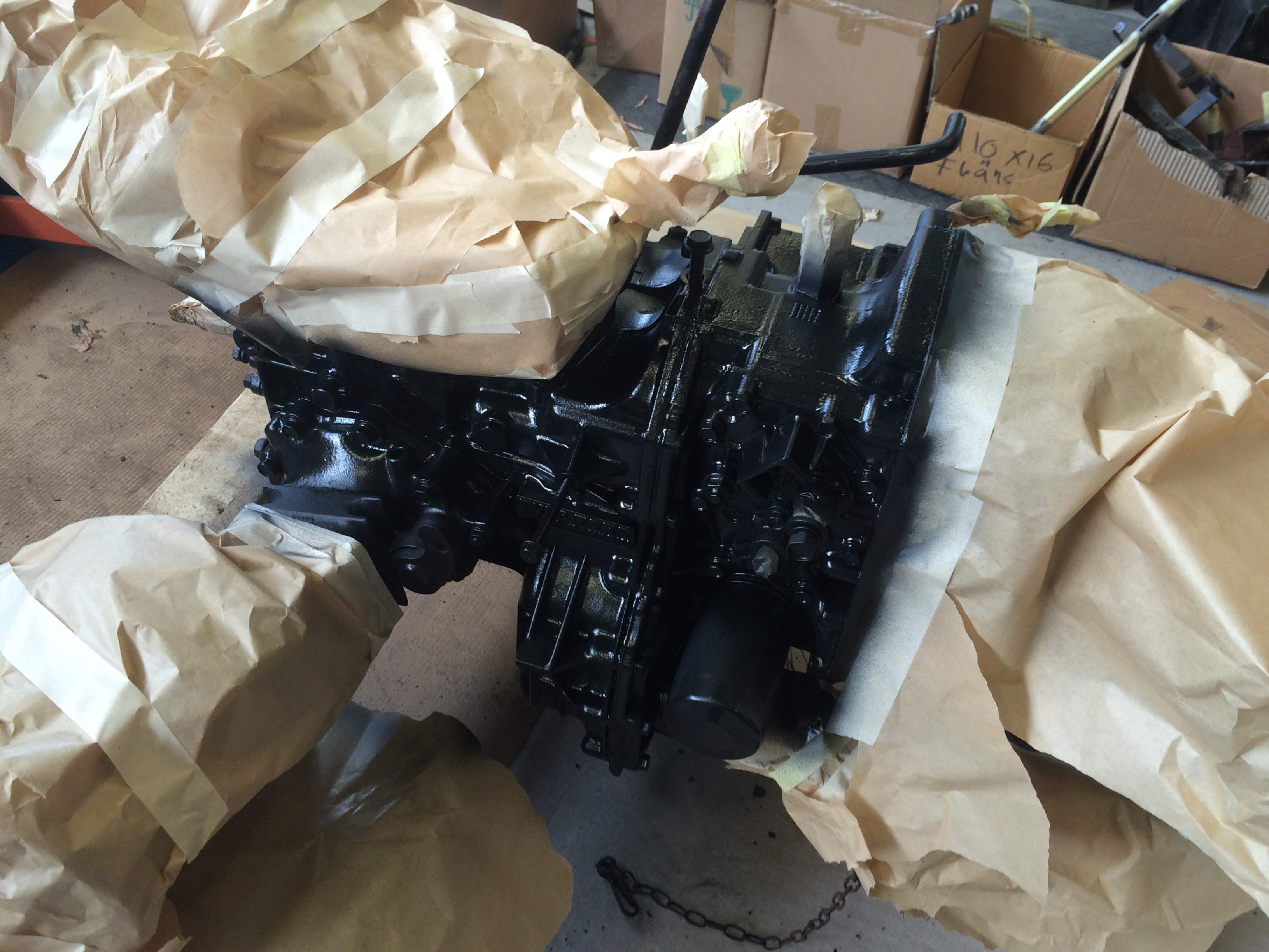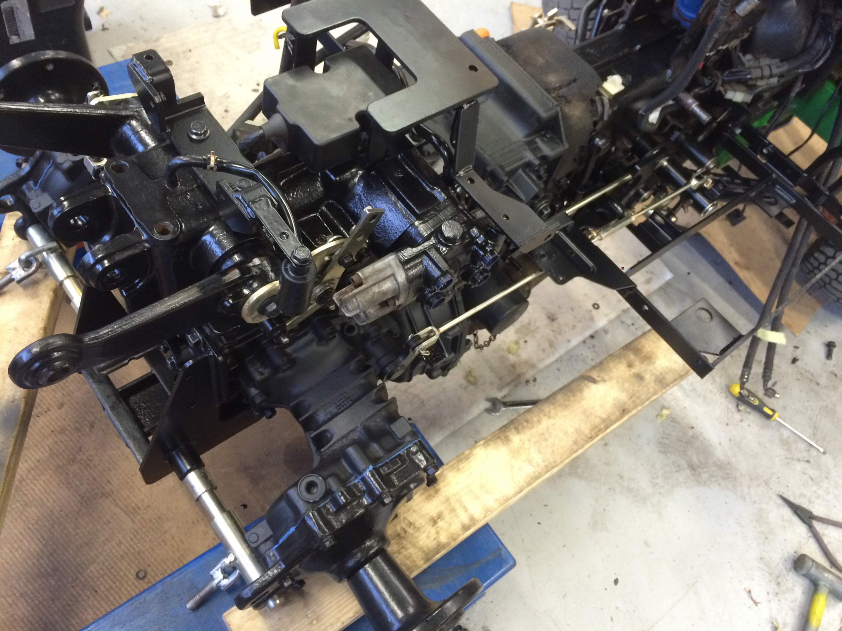 So basically almost all removable parts has been removed from the rear end and the 3p hitch housing was painted first. Afterwards I masked a few bits and continued with the aluminum tranny cases using the same paint as previously uses on the final drive housings.