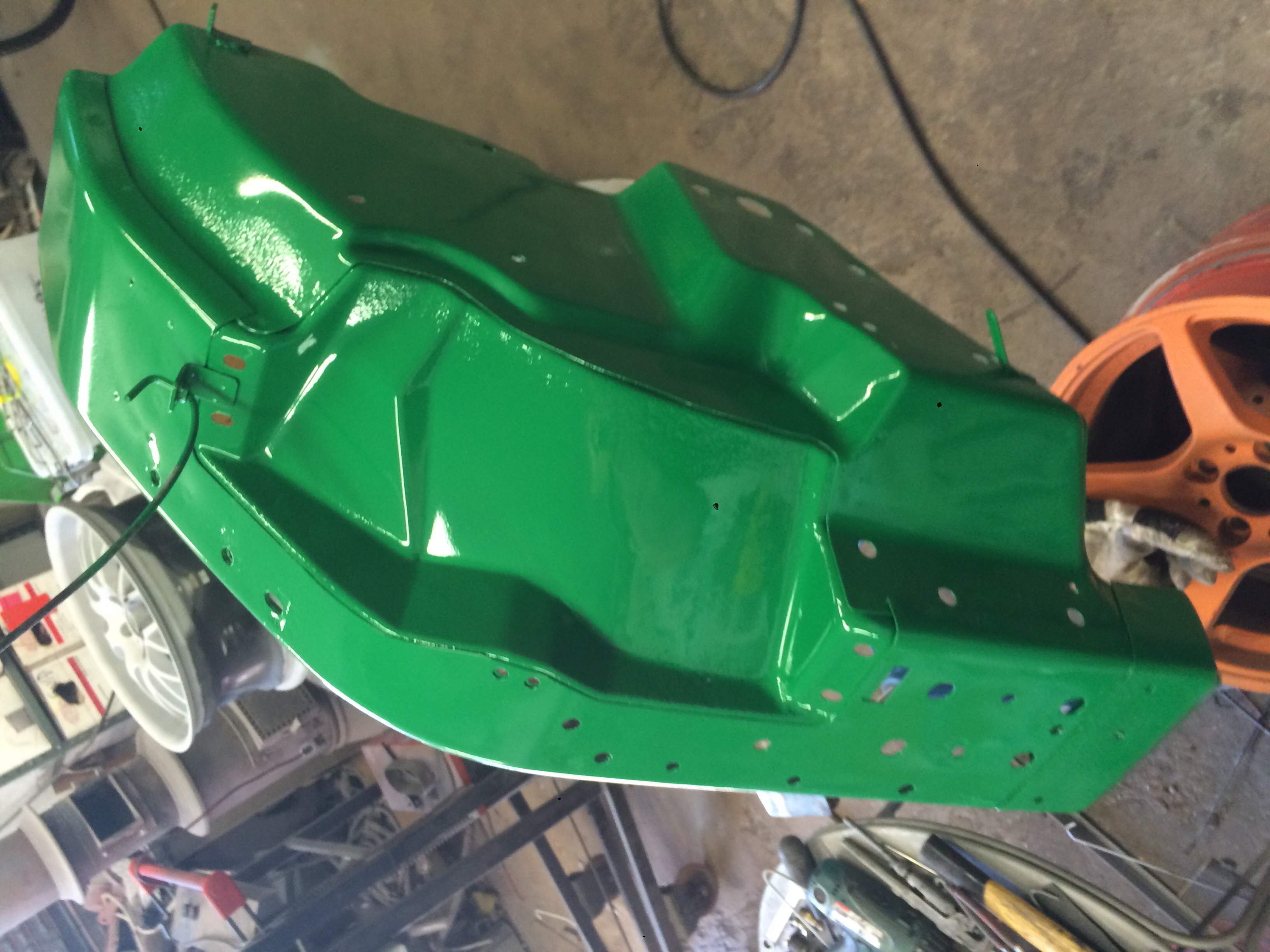 The green parts has been painted with RAL 6029 which is not the right color but that's what the powder coater carried. And since I will be wet painting all the green parts nonetheless in order to get matching color on the plastic and sheet metal parts I might as well have some green unserneath, rather than black or similar, so that future scratches won't show as much.
