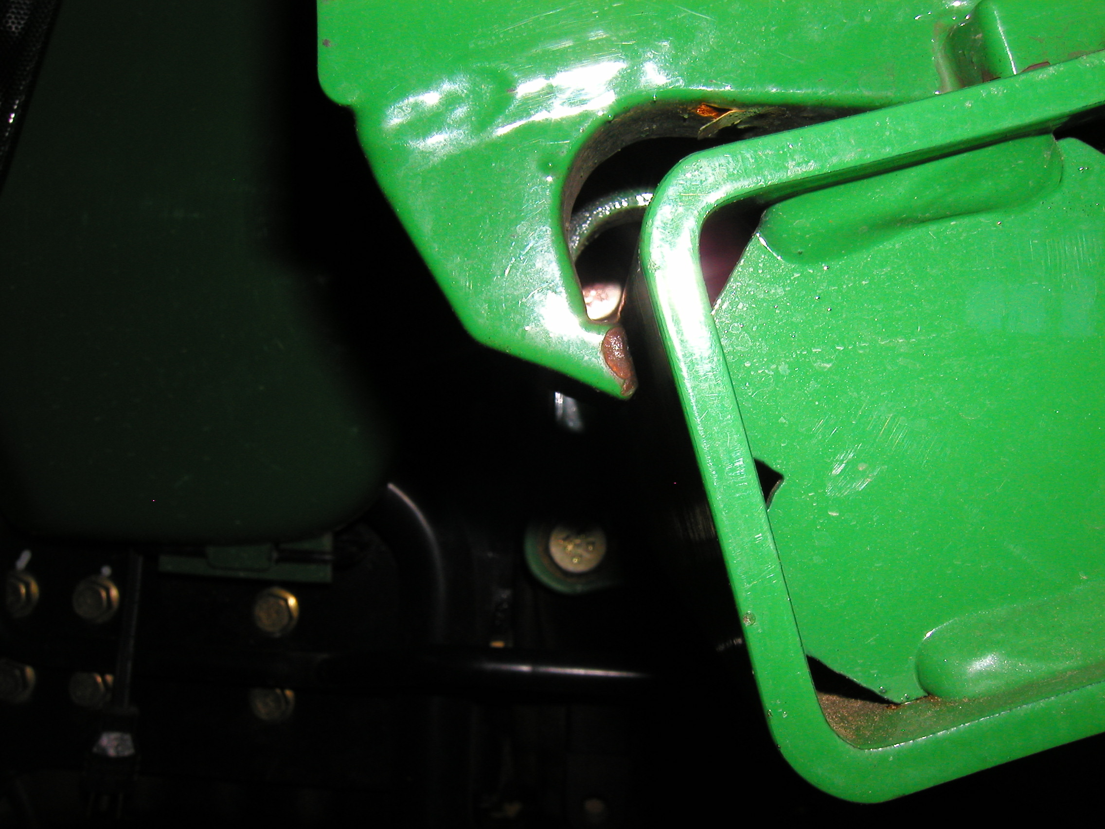 JD4300; Mine started out that way. A small gap ( 1/16-1/8" in the bracket )translates into a large amount of slop on the far end.