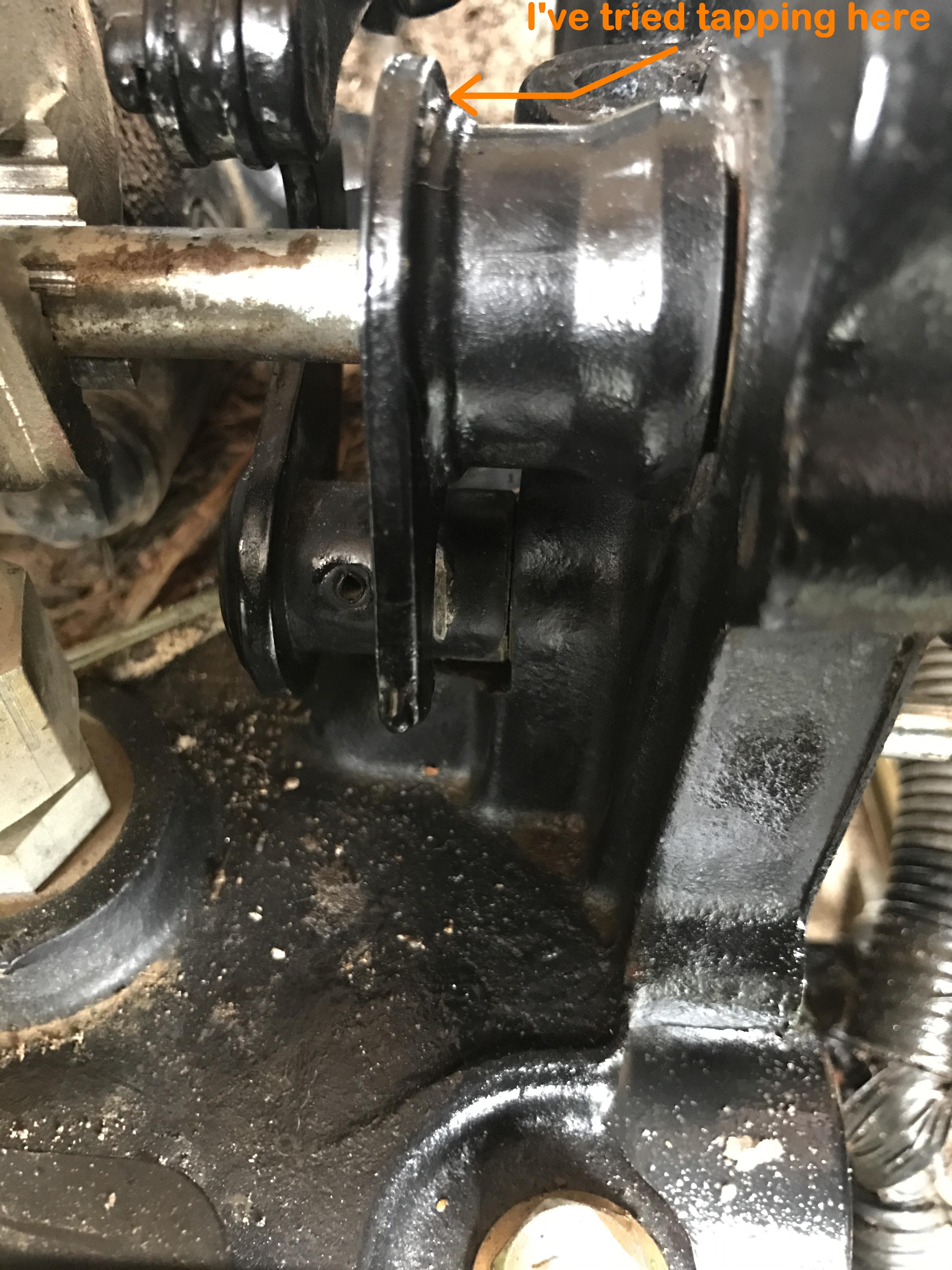 Welcome to TBN. Your pic that points to the shaft end where you have tried tapping, I believe is the correct thing to do. I remember having to get a 3 lb sledge, having only a very small space to swing it. I made a custom length shaft to punch the end of it. Try what RNG told you. It is rusted and stuck.