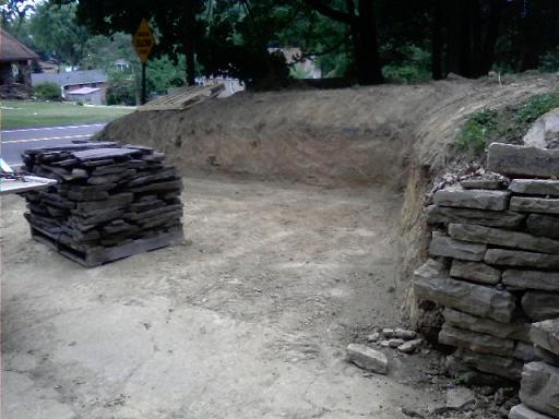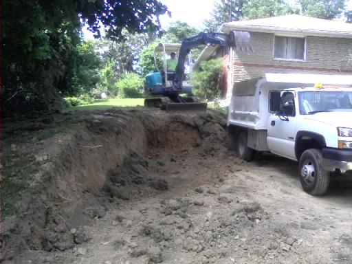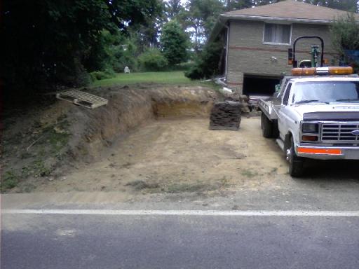 dug out 5 trailer loads of dirt last week for guy down street, and friend of mine wanted a parking area cut out of hillside,for his wifes car. So yesterday nother friend got an excavator;1. cause it was alot of dirt to dig out and 2. time was a factor. we wanted the rough hole done in 1 day. 22' x 12' with angled rear wall. Derek dug,I ran dump truck,15+ loads approx 100 ton dirt total. pic 1 is rough dig out-1 day,pic 2&3 I came back and smoothed,dragged and beveled sides with the 2305. see it hiding on my flatbed. bit less than 2 days. also dragged pallet of stone off truck bed with Greenie. Getting hang of tractor use,didnt even hit the old wall still up on other side of driveway.