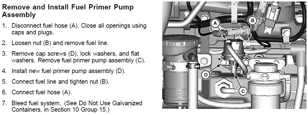 One thing that threw me off is that there is a manual fuel prime pump located just above and to the left of the long filter. It has a rubber line going into it, presumably from the fuel tank, and a steel line going out to the long filter. The long filter, in turn, has a steel line going to the input of the short filter on the other side. The output of the short filter then goes to the high pressure pump.