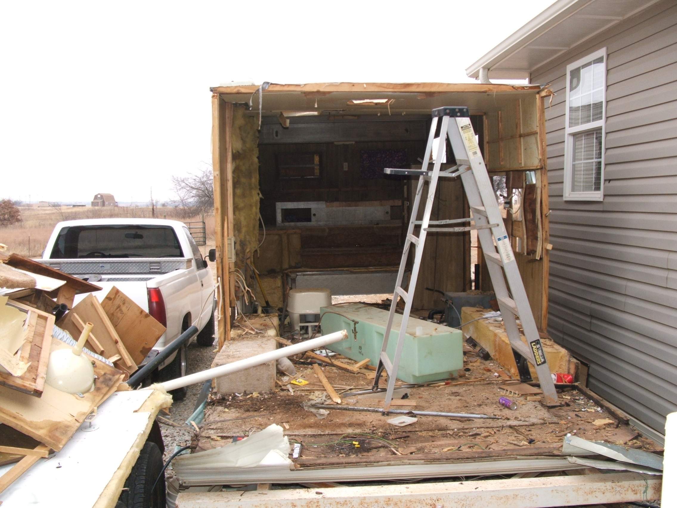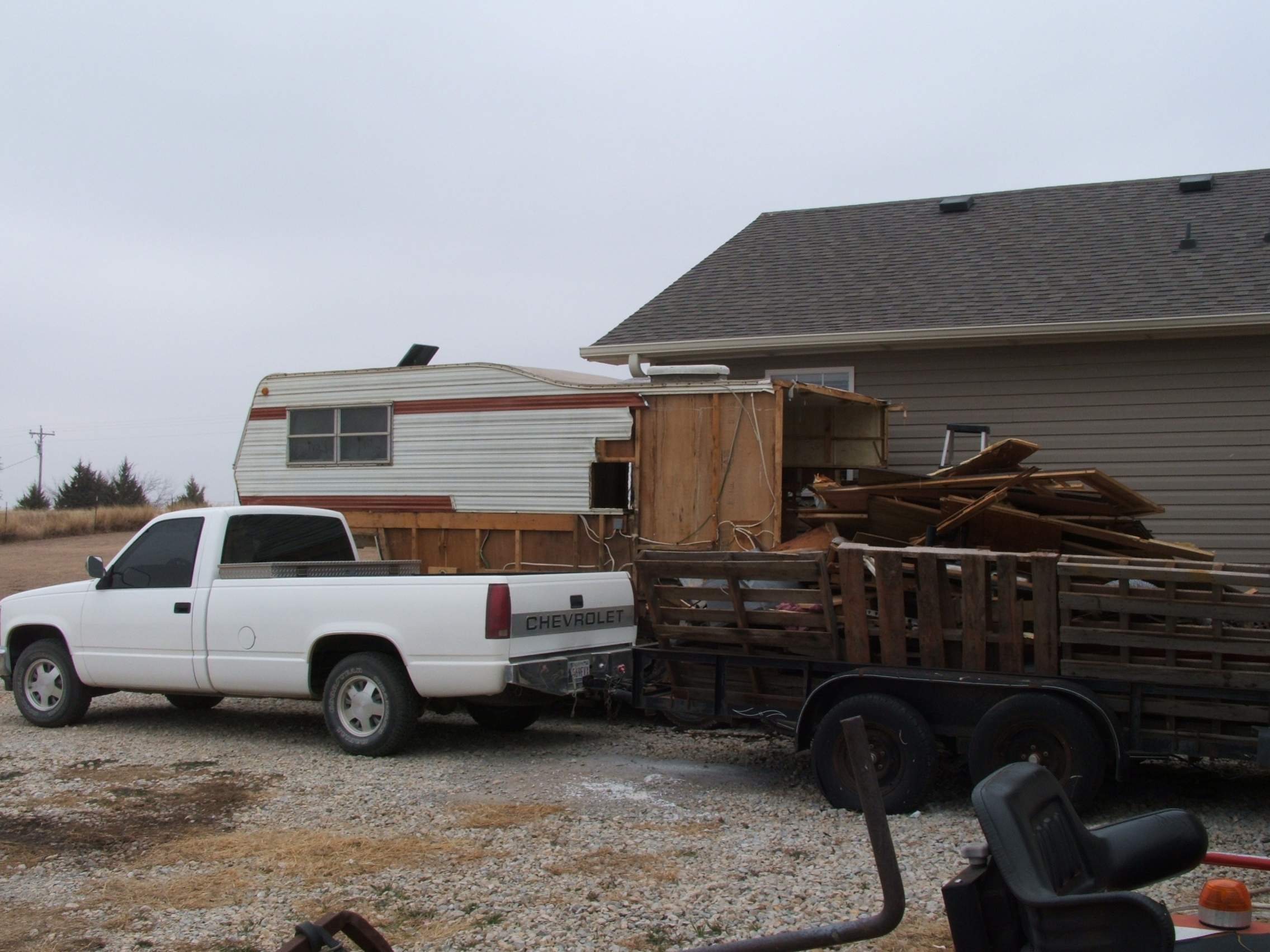 Any of you have expierence dismantalling a 5th wheel. So far it is a pain in my U know what. Was thinking of demolishing it with my front end loader on my tractor. Also thought about burning all the wood material off. But I guess the old hammer and pry bar is working for the time being. I intend on making this a flatbed, with a possible hydraulic tilting bed that turns into a ramp. I got this trailer this weekend, off Craigslist in the barter section, I traded a old aluminum boat for it. The trailer is a 26 foot Nu-Wa, tandem axel. I was thinking of adding a third axel to it, but not totally forsure. I know I can't afford a nice goosneck so I thought this would work. I would eventually like to be able to haul up to 10k on the trailer. If you have ever built one of these or have a suggestions Please let me know, Thanks.