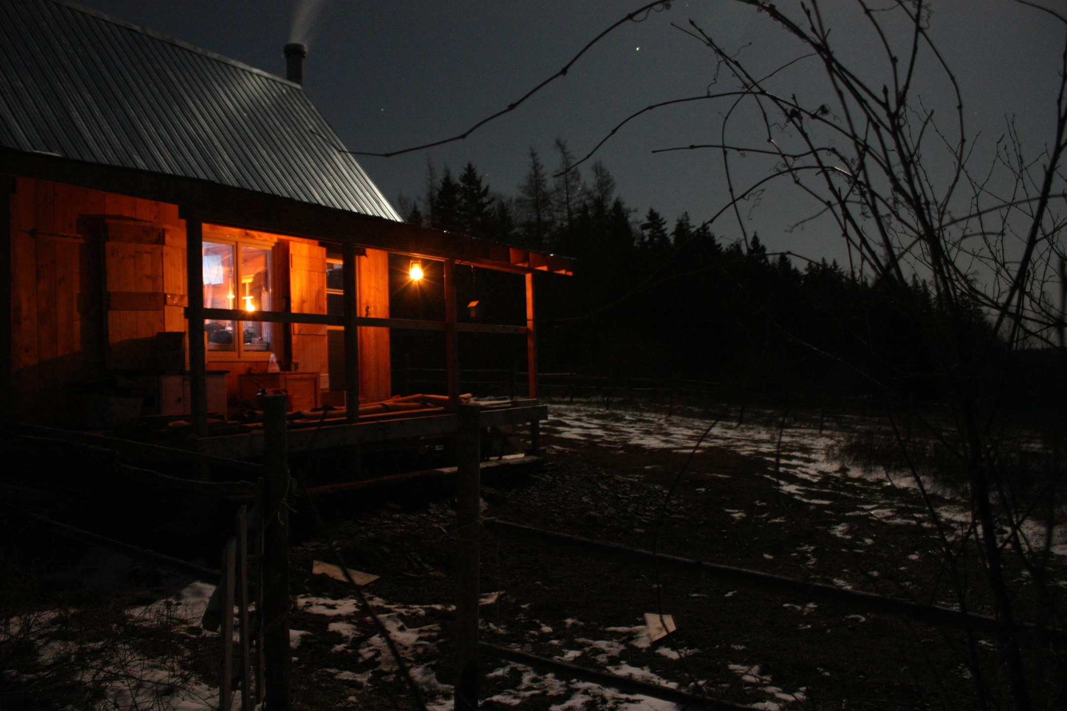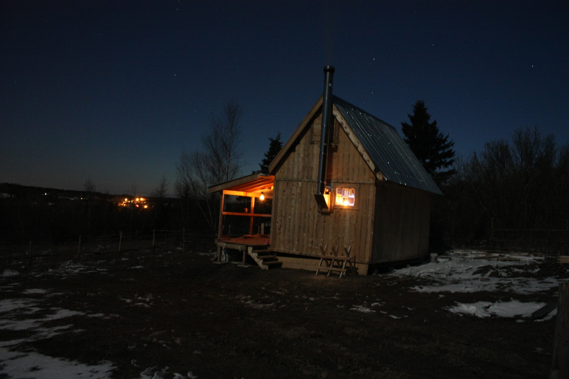 Glad to hear you are back to work on the cabin. The second pic, taken at night with the lantern on the porch and smoke rising from the chimney is very nice.