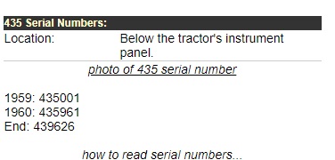 Serial no.'s won't show his tractor photo's. Hope he has some to post up. Here is tractordata.com image of their serial numbers and years. The end of the 2 cyl. era.. Deere's attempt to use a General Motors 2 cyl. diesel.