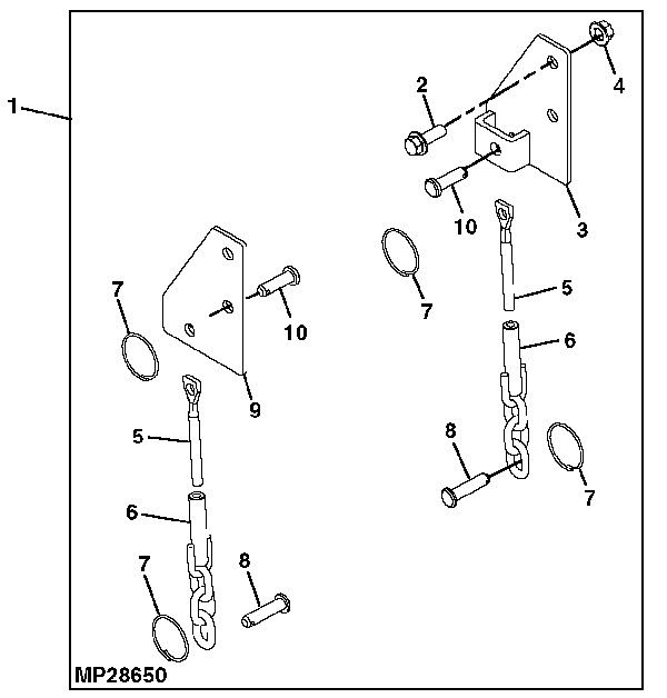 Don't have any pictures handy, but here is the parts diagram from the JD web site. The top triangular-shaped piece bolts to the fender bracket. Parts #5 and 6 are a turnbuckle that is welded to the chain which attaches to the three-point arms.