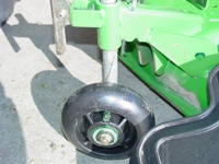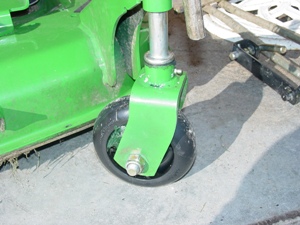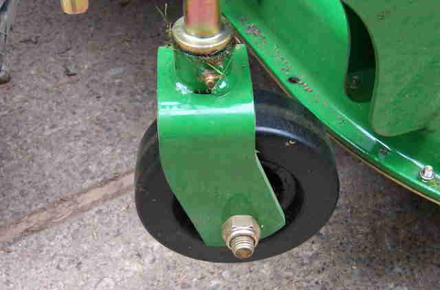 On a different note, but still related to the wheels on the deck.... When I try to mow close to things as I turn, the axle bolt on the back deck wheels can easily strip the bark off a tree or get caught on fixed structures. Have any of you good thinkers come up with a way to move the back wheels inward or at least reduce the way the axle bolt sticks out? I have considered putting a smooth cover over the bolt, moving the wheels inward, or letting them caster. I'd love to hear your ideas!