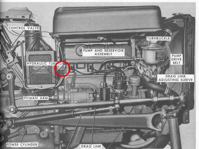 Here's a scan of a photo showing power steering components, but it also shows the location of the temperature probe (circled in red).