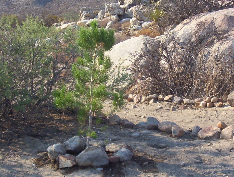 I have only owned the place since 2005. I did some experimenting two years ago and planted a few Afhganistan Pines, a Monterey Pine last year (our live Christmas tree) then I put in two Apple Trees, and Two Peach trees and a few palms. Everything made it so far (except an apple tree the deer ate) the Afhganistan pines grew the fastest. The one in this photo taken last year is now about 6ft tall, so then I ordered the 50 Elderica Pines which are fast growers, and suppose to be drought tollerent.