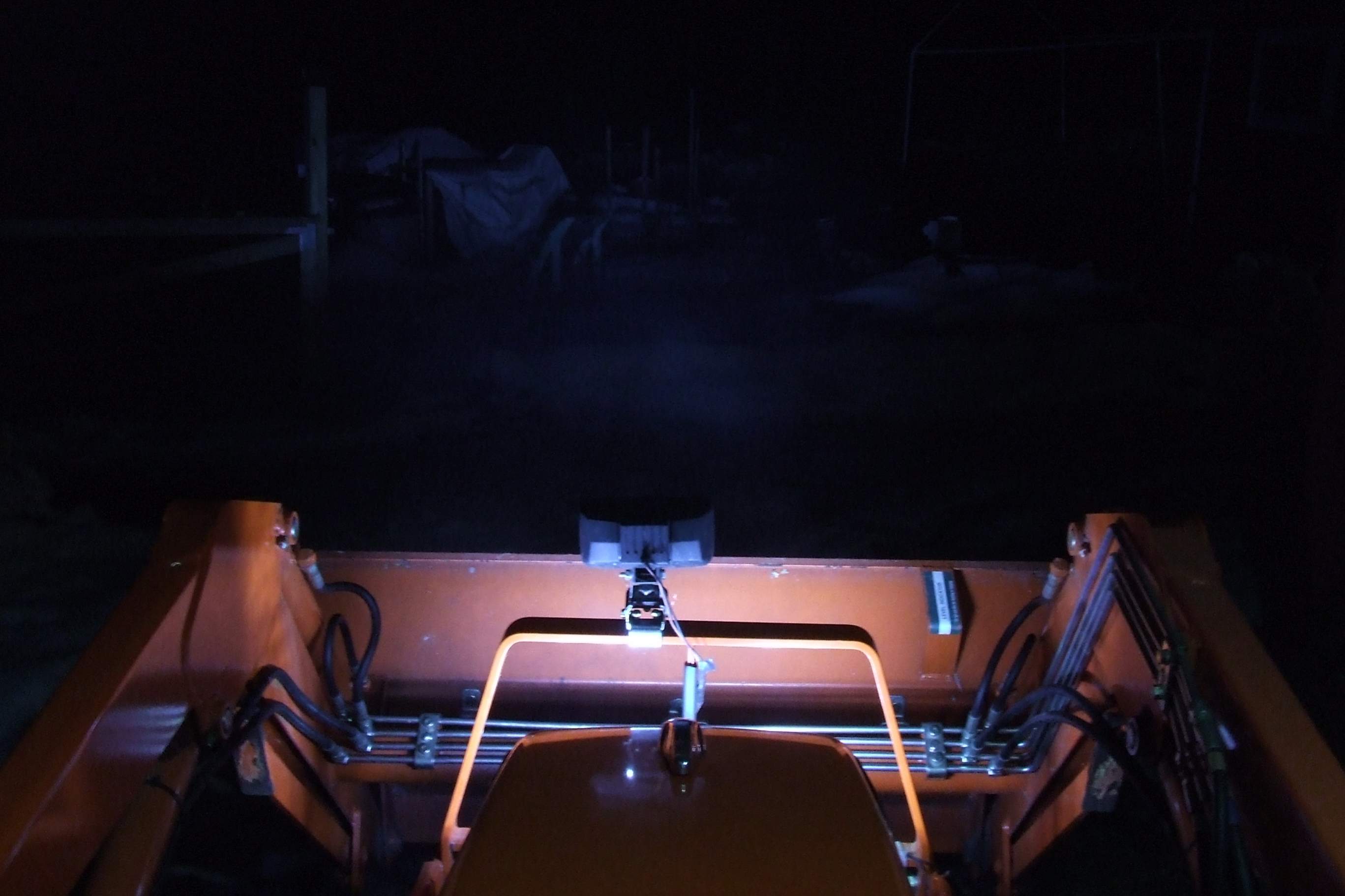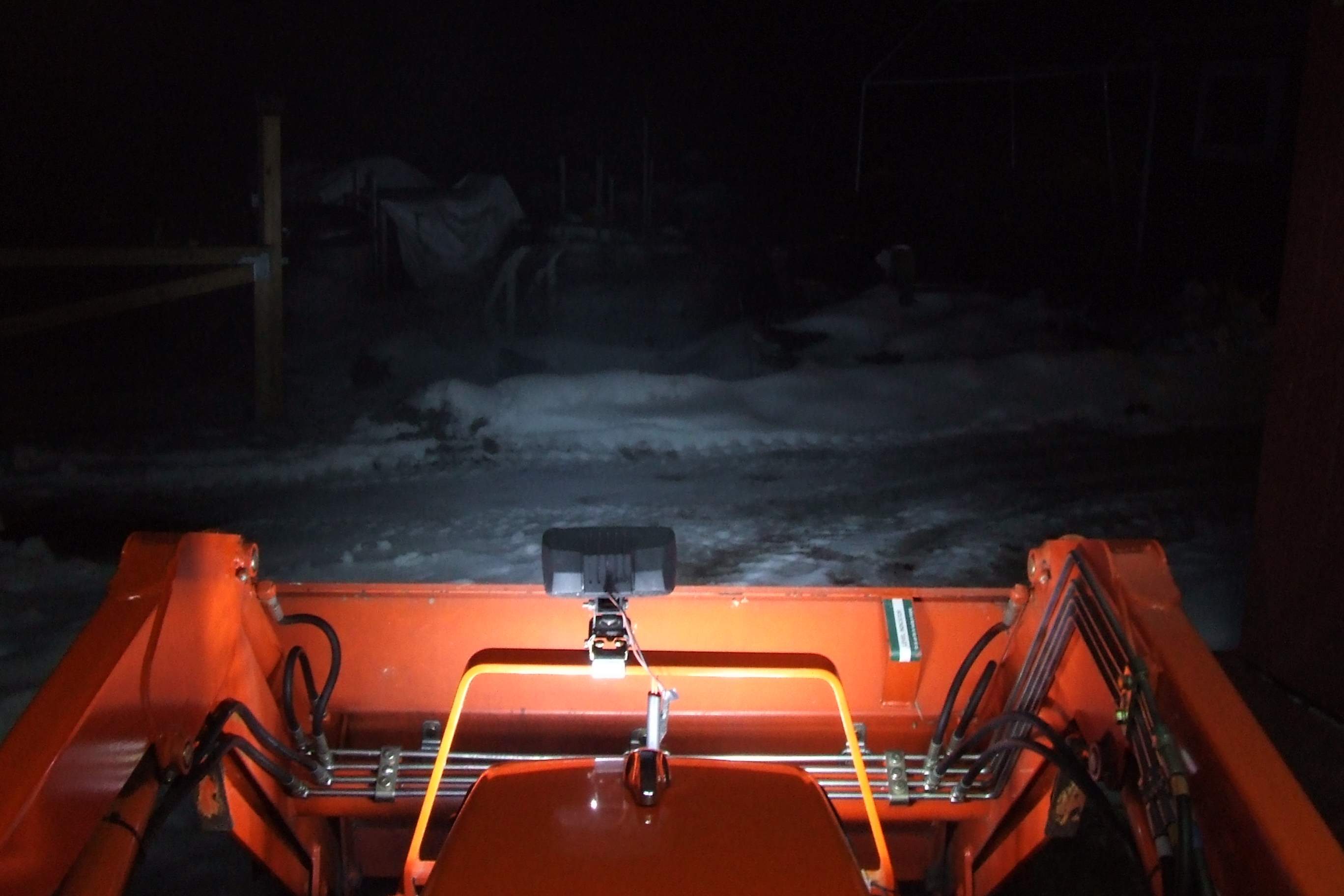 As you can see, the loader area fills in nicely even if you've got the headlights covered. If you're working up high with the loader, like dumping into your pickup truck, you can see the loader clearly without a lot of glare. Since the loader lights are under the edge of the canopy, they don't get affected by rain or snow.