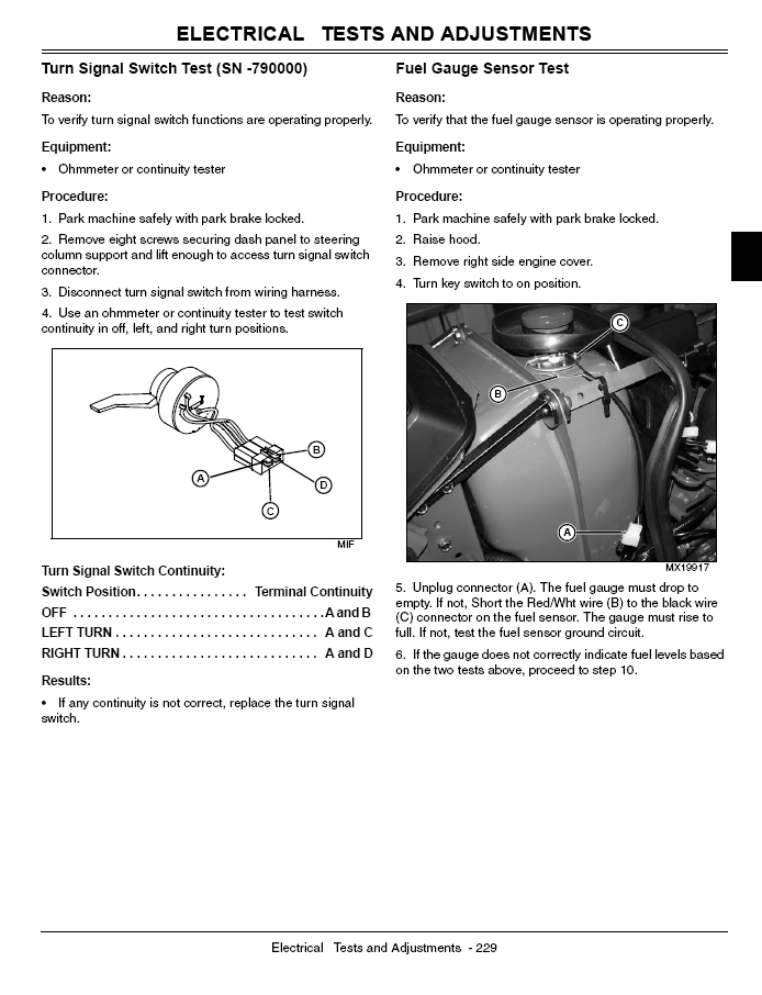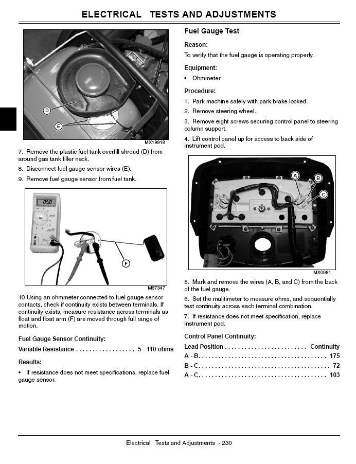 Your JD shop manual should have good proceedures to follow to narrow down the problem. You may want to start by removing the fuel cap and peering inside to see if the float arm has come loose? The side of the tank should have a variable resistor, reostat electric sender unit that moves with the arm/float going up and down. I believe if you unplug the electric plug on the tank sender and put a volt/ohm on resistance when you gently push the float/arm down the meter should change resistance reading if the sender is good. Change the volt/ohm to DC about 100v and check to see if you have current/volts on the elec plug before you plug it back into the sender unit, when you turn the engine on. Did you check fuses? Any other electric problems? The shop manual has a step by step instructions and is worth ownership. ---Fuse
