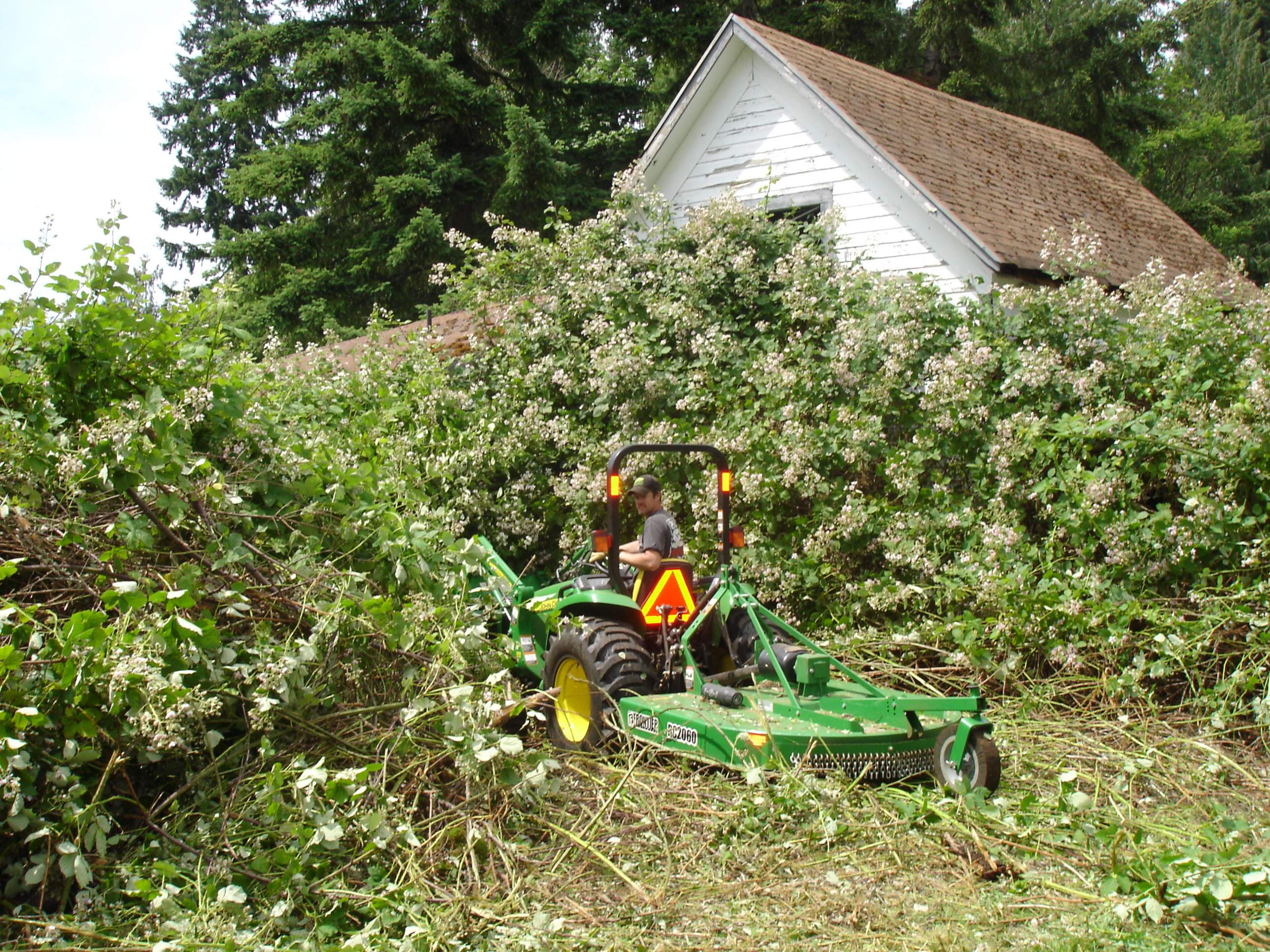 We purchased 80 acres and finally signed the papers in June. The property has a house on it for the building rights only, it is uninhabitable and of no value. There is a huge amount of work to be done on the property that I will be doing most of it myself. I am a Commercial Fisherman so I have 4-5 months out of the year to concentrate and devote all my time to the project. Being as it is going to be a big project I figured I might as well keep a running account of the progress. My first order of business was to start clearing blackberries, 80% of the property is overrun with them and couldn't even drive through the gate, and get a new road back to the building sight. I ended up buying a 2013 JD 3038e with 5 ft brush hog and a brush rake for the FEL. My girlfriend has never driven a tractor before so I wanted to get something small enough and easy for her to operate but still have a decent amount of PTO hp. I knew there was going to be other bigger equipment later on so I wasn't too concerned about it being big enough. I'm very happy with the choice. Here's some pictures of the clearing of the entrance.