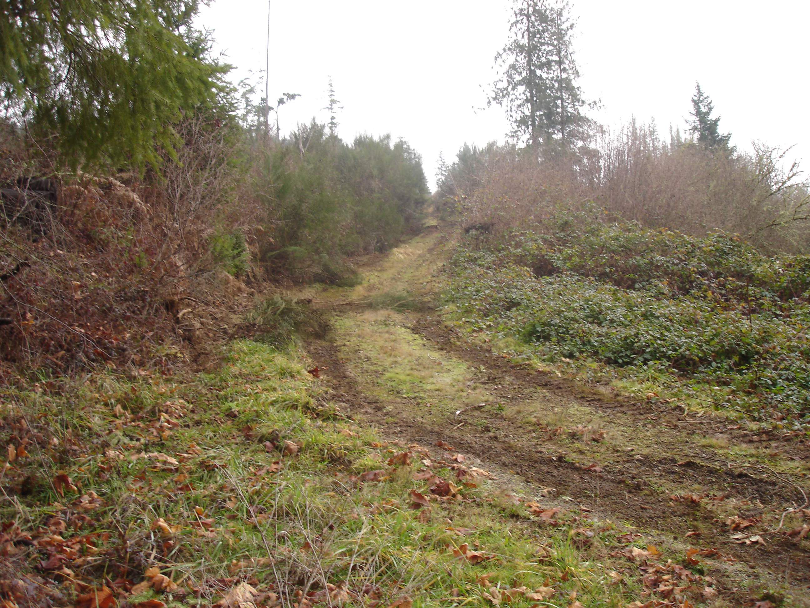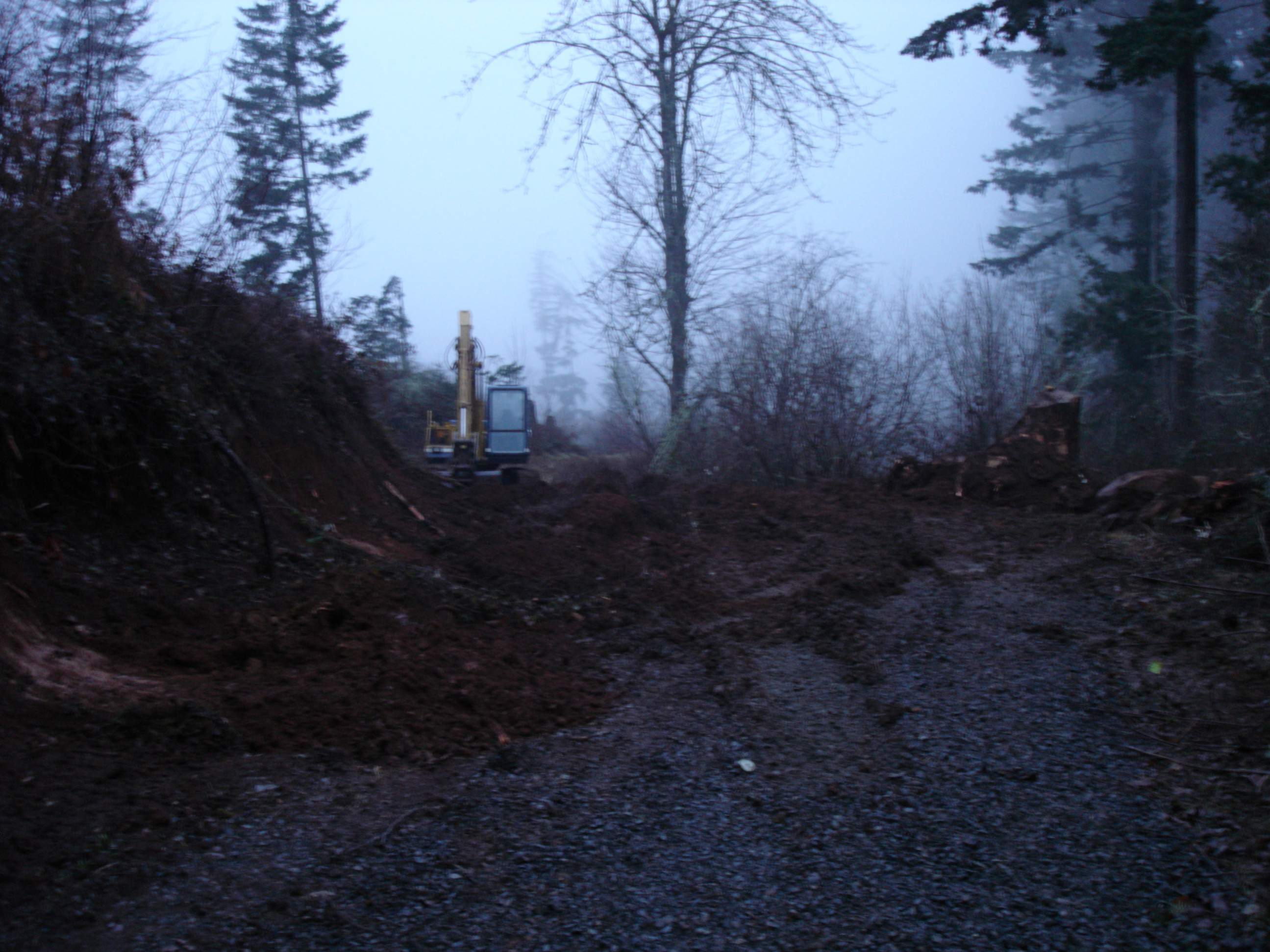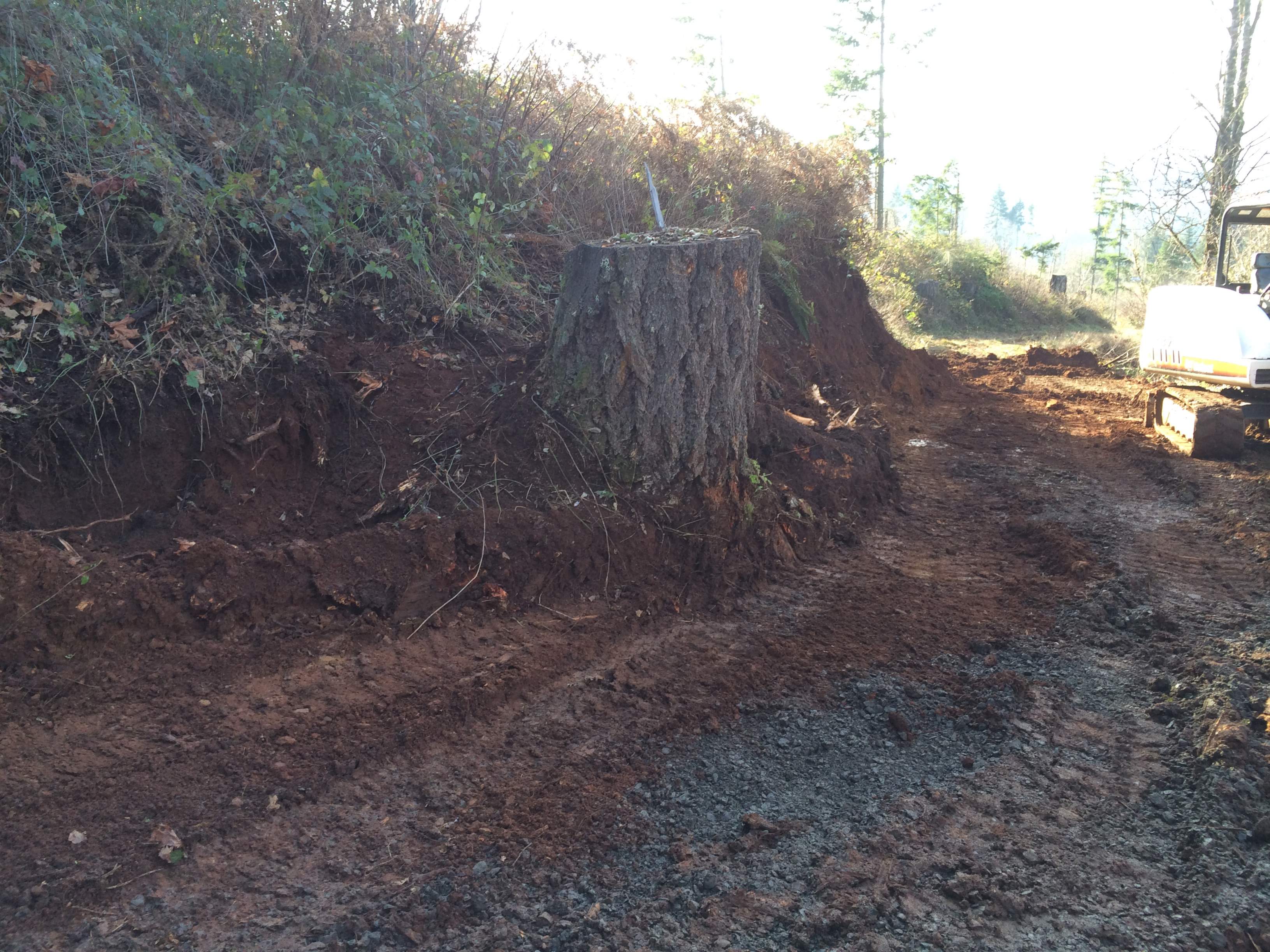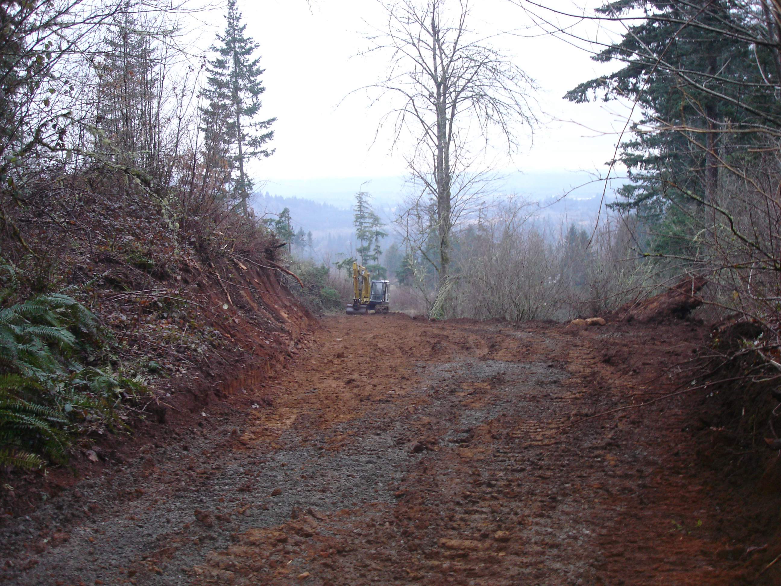 I ended up having to dig out the uphill side with the excavator, then hop on the dozer and push it to the downhill side. I need to widen it out and straighten it up some, the downhill side is 65-70% slope so you definitely don't want to get to close, 80ft to the bottom. There is about 400 ft of this before it gets more level. The ground has gotten too saturated at this point so I'll have to wait until it dries out some to finish but I was able to clear the scotch broom and blackberries and located the spring.