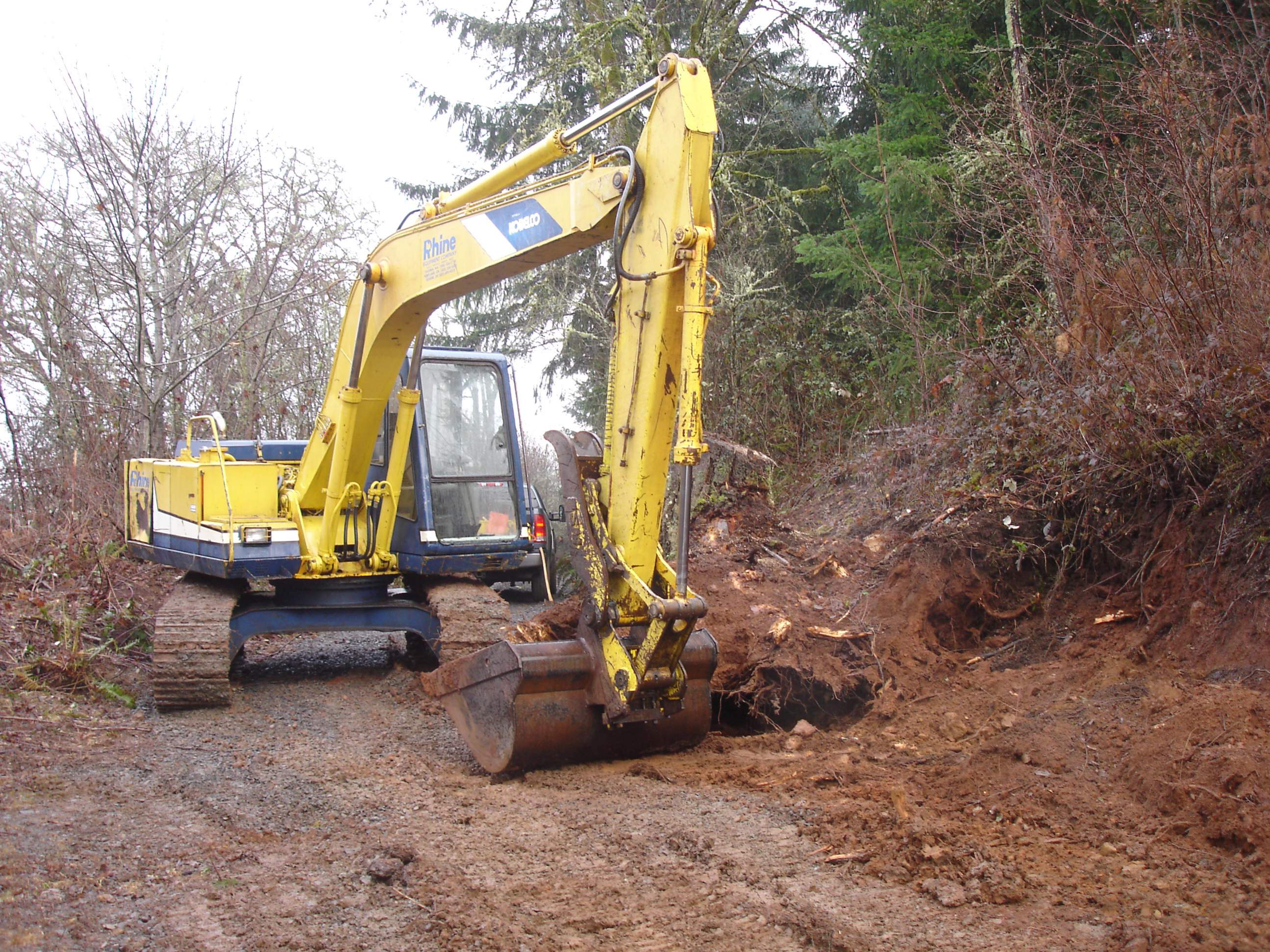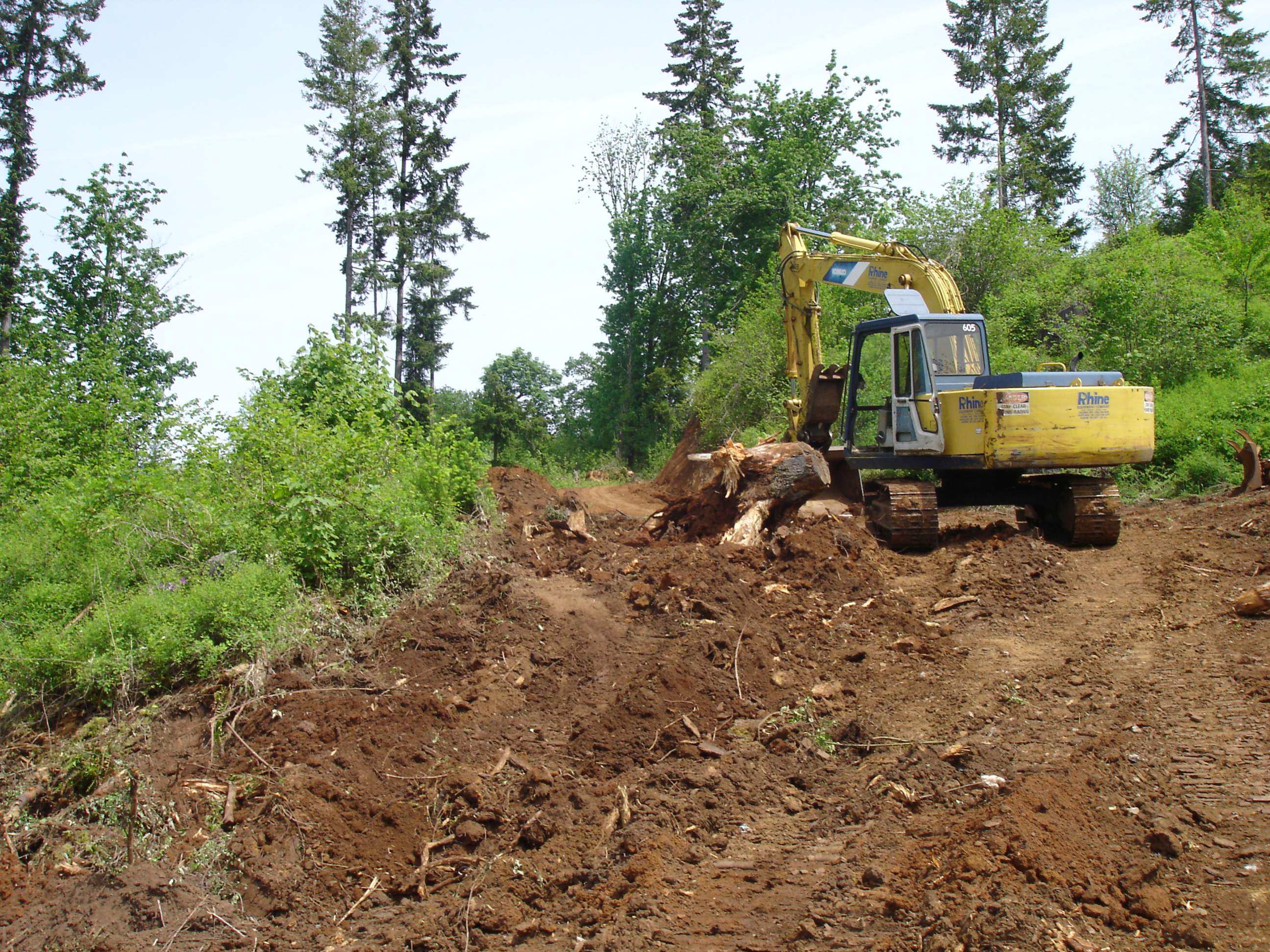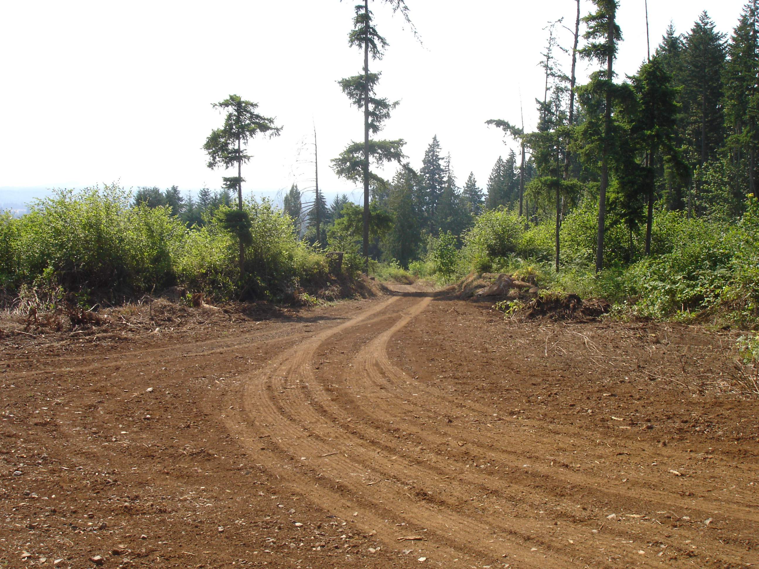 I ended up having to dig out the uphill side with the excavator, then hop on the dozer and push it to the downhill side. I need to widen it out and straighten it up some, the downhill side is 65-70% slope so you definitely don't want to get to close, 80ft to the bottom. There is about 400 ft of this before it gets more level. The ground has gotten too saturated at this point so I'll have to wait until it dries out some to finish but I was able to clear the scotch broom and blackberries and located the spring.