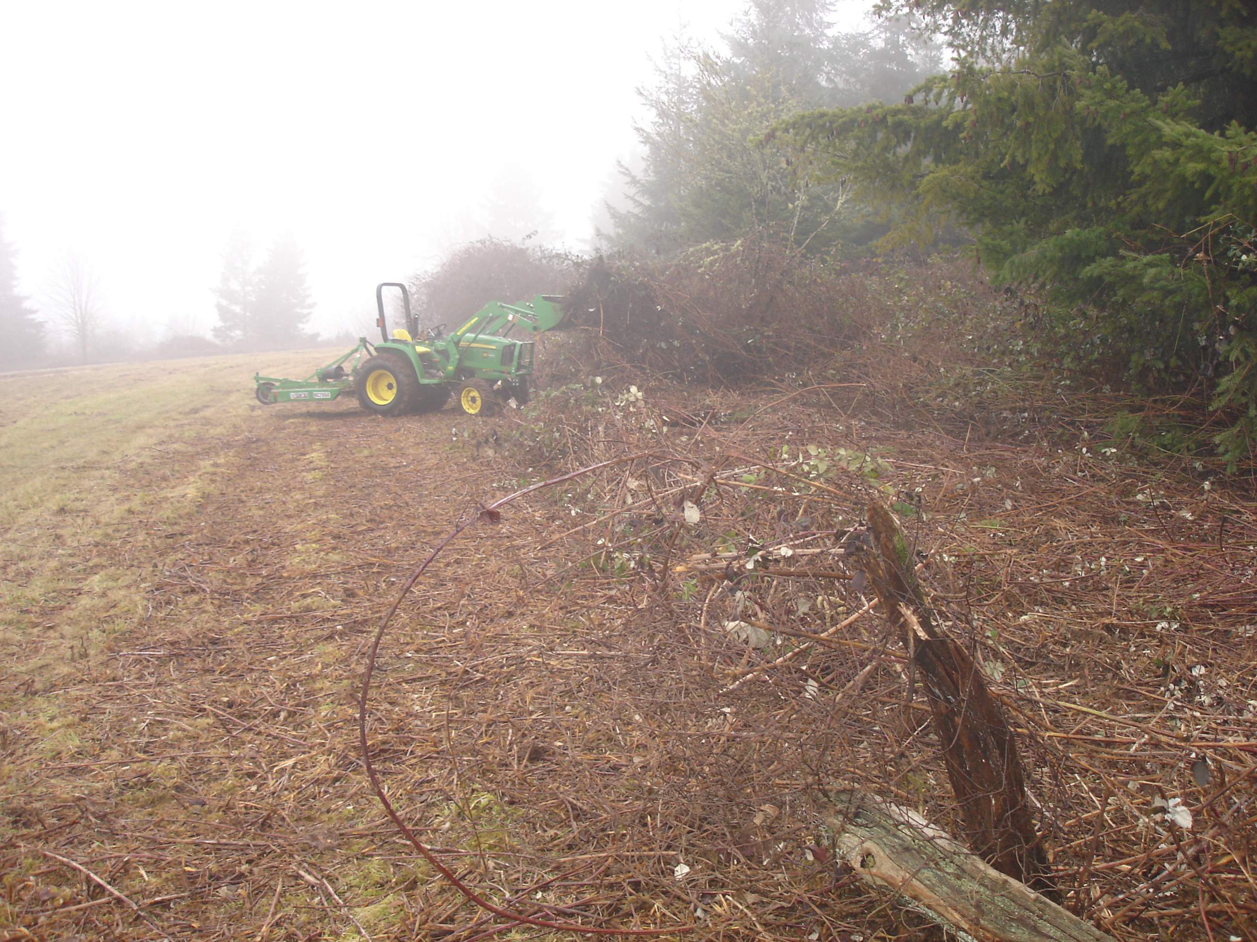 The large piles of dirt/vines do become a problem to get rid of since they do not burn too well. Mine smolder for weeks due to all the cold wet dirt. I just keep pushing it together and let it go but I am thinking of burying some of them in an old creek swale. I have not been brush hogging because I need to get down to be able to seed and pasture and my berries are so thick I end up with about 12 to 18" of chopped canes. So pile and burn. I have had two visits from the fire department in the last month (neighbors complaining), but I am not stopping until I get done. I can only get to this chore on weekends so it is taking a while.