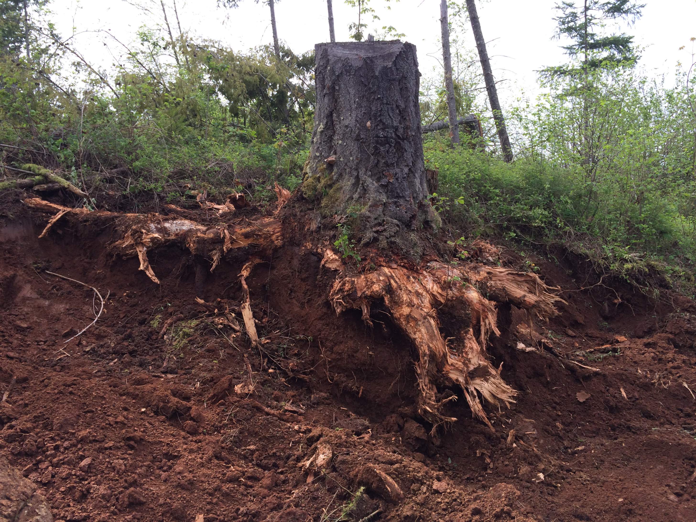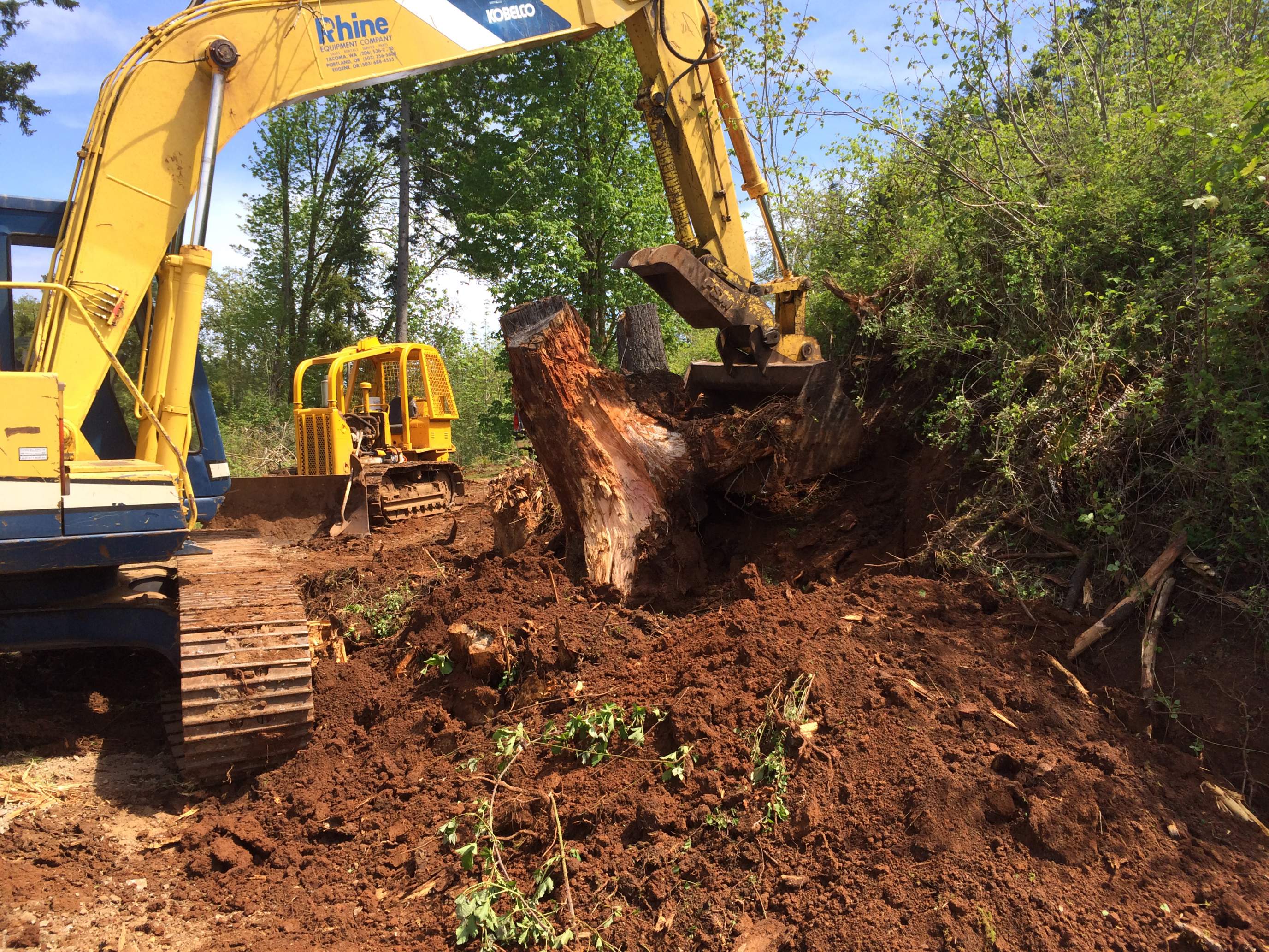 Finally decided what size excavator to purchase. It was a struggle, I really liked the Midi-sized ones with the blade so you could work one area and move on but what I didn't care for is the blade is fixed angle. Kubotas have some with an angle blade but then the task was to find one close enough I could test and they are a hot commodity around here and aren't listed for long before sold. I ended up buying a Kobelco SK120 with 5500hrs from a local ag dealer, pins and bushings are pretty tight, all fluids and filters were changed and they had no problem with my request of a full tank of fuel. It doesn't have the blade but i figured I already have the dozer and having the 6 way blade is crucial in order to put angles on the driveway for runoff. Made a couple cuts with the Stihl ms310 on the bigger roots and the Big "K" ripped that first stump out no problem. As you can see by the size of the root ball there was no way to pick it up but I was able to push it off to the side and tip it over, hopefully the rain over the next few months will wash most of the dirt off and I can get back at it with the saw.