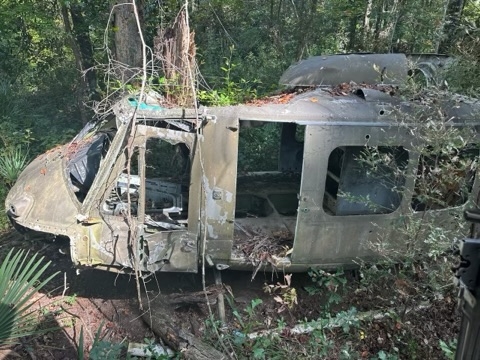 We found a helicopter chassis out in the heaviest area of the property. I don't know much about helicopters but it sure looks like an old Huey from Vietnam. After some digging and talking to the neighbor I found an old picture of it along with the new photo that I took. Had the loggers clear out around it to protect it for now. Also found the remnants of a crumpled up Cessna.