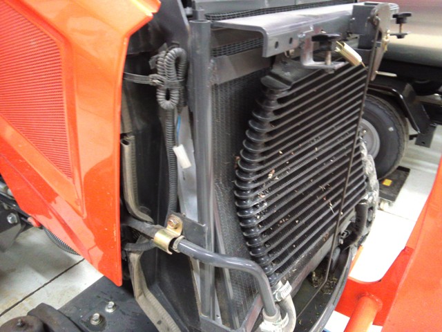 YIKES! My fan looks like that too. I was clearing some brush when the tractor started to lose RPM. It was making a **** of a noise and a puff of smoke came out from under the front. I backed out and drove up to the concrete driveway and went through all the motions with the FEL and there was no liquids on the concrete. I didn't see any visible damage so I went back to work. I didn't see the fan until I did an oil change. I guess I got lucky and it was just a stick that got in there from underneath.