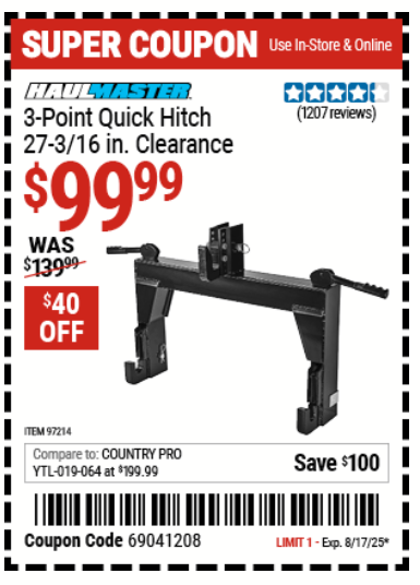 Also on clearance from GWT is the standard Speeco Quick Hitch for $229.