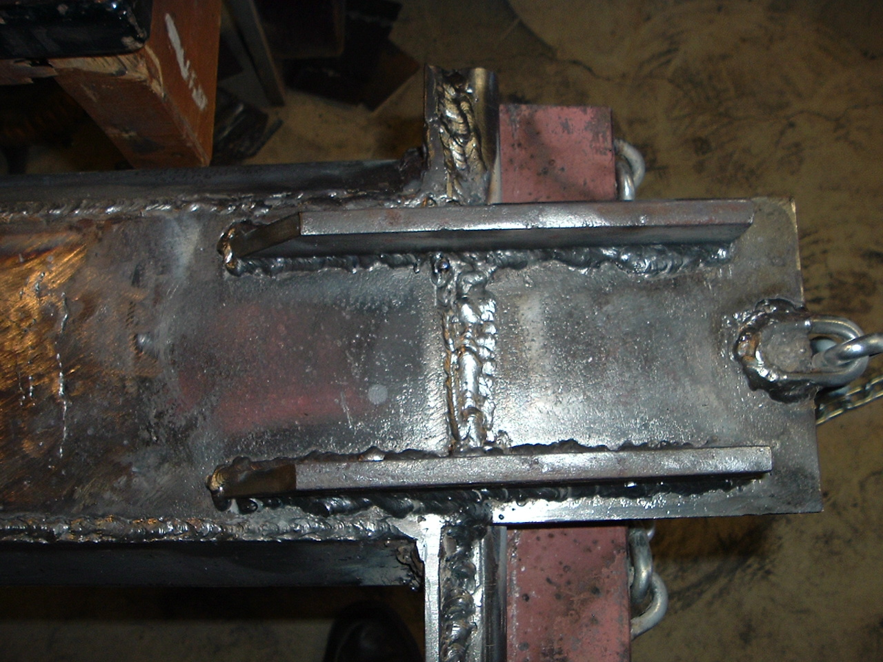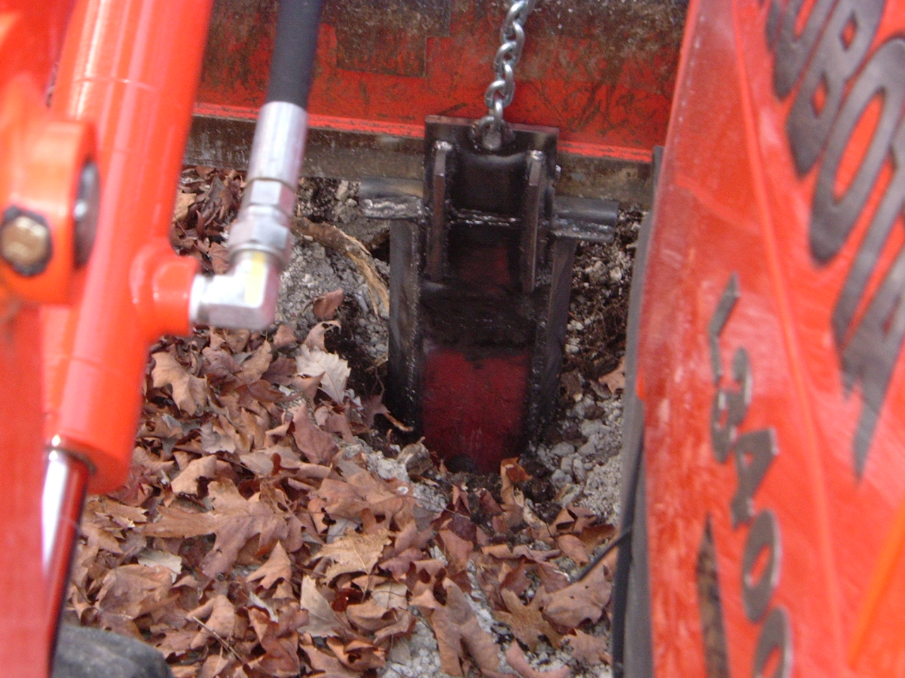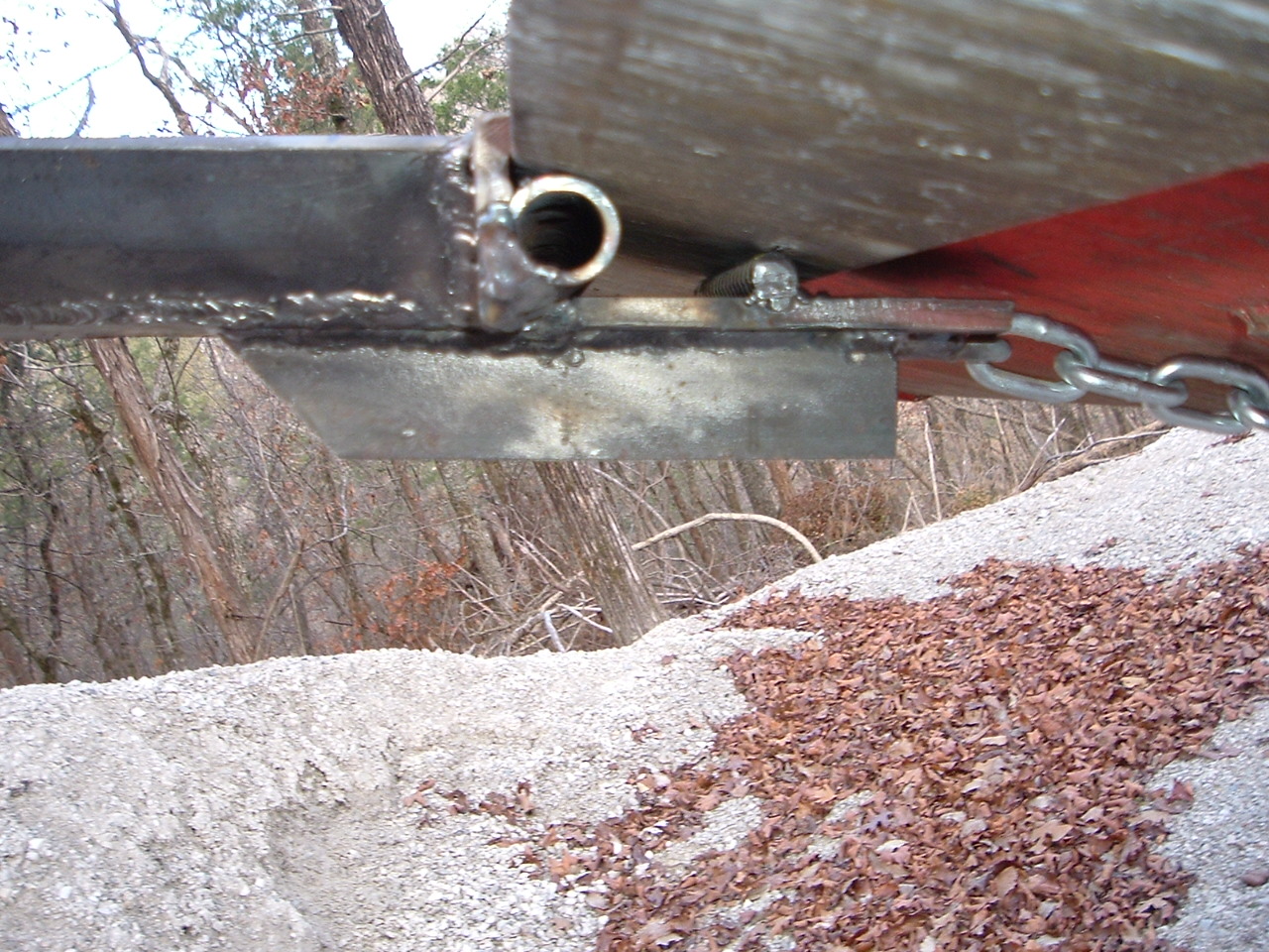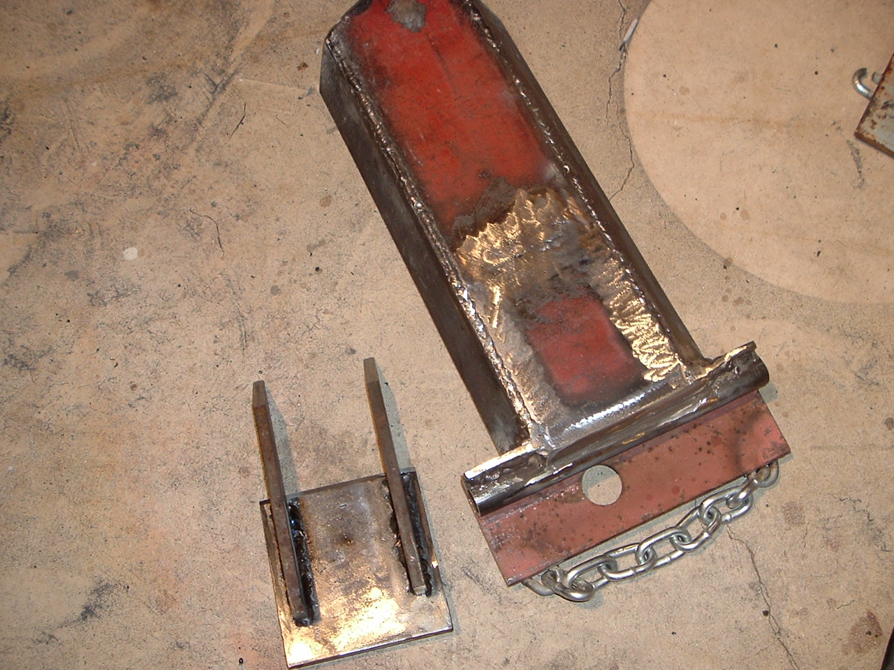 OK bad news and good news on the Shovel project. Finished it up this eve, except for paint, though I would try it first before painting, that was a good idea, I was digging along fine, when I hit a small root, and bent the underside of the "floor" that was contacting the bottom of the bucket, like an aluminum candy wrapper. Was curling at the time, and it bent fast!. Bad news it is bent, good news is all the welds held perfectly!:thumbsup: The floor material is the scrap 3/8 thick construction steel I found. and welded 2 pieces together, which are down in the middle of the shovel area, and un-affected by this. I am thinking if I can get that large of a chunk hot enough with my #3 welding tip or maybe the cutting tip of bending it back (you can see the stress where the old red paint was and then popped off), and then getting a piece of angle iron to weld on the bottom starting about where the underside chain fastens on then extending at least half way down the shovel floor then the nose of the angle iron chopped into about a 30 degree angle as it meets the dirt. I am open to suggestions. I have my own ideas on how to fix this and carry on, but I would like to hear from others as well. Did I say that all the welds held perfectly?:laughing::laughing: