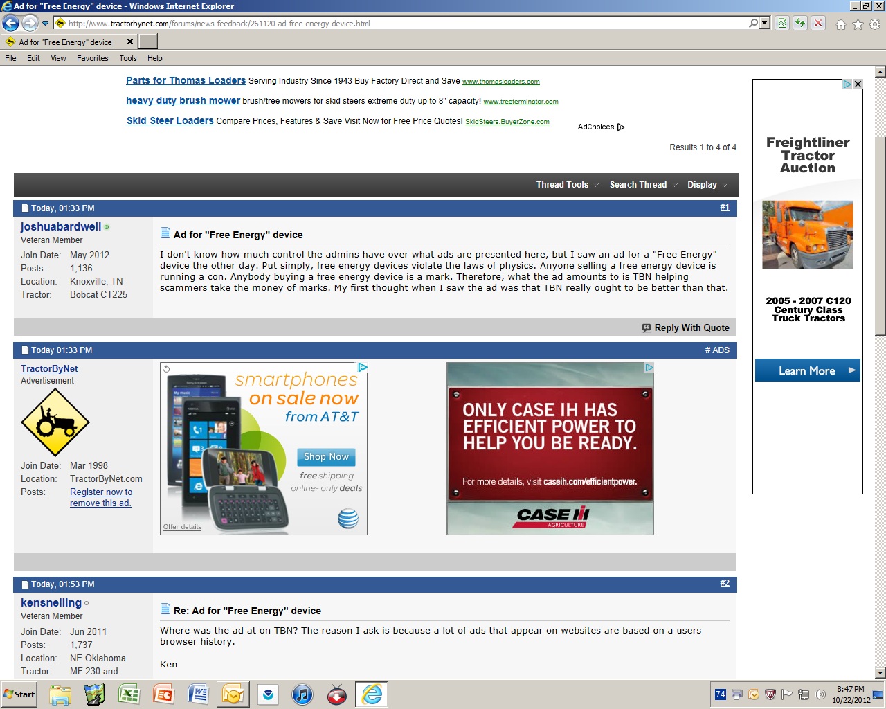I don't know how much control the admins have over what ads are presented here, but I saw an ad for a "Free Energy" device the other day. Put simply, free energy devices violate the laws of physics. Anyone selling a free energy device is running a con. Anybody buying a free energy device is a mark. Therefore, what the ad amounts to is TBN helping scammers take the money of marks. My first thought when I saw the ad was that TBN really ought to be better than that.