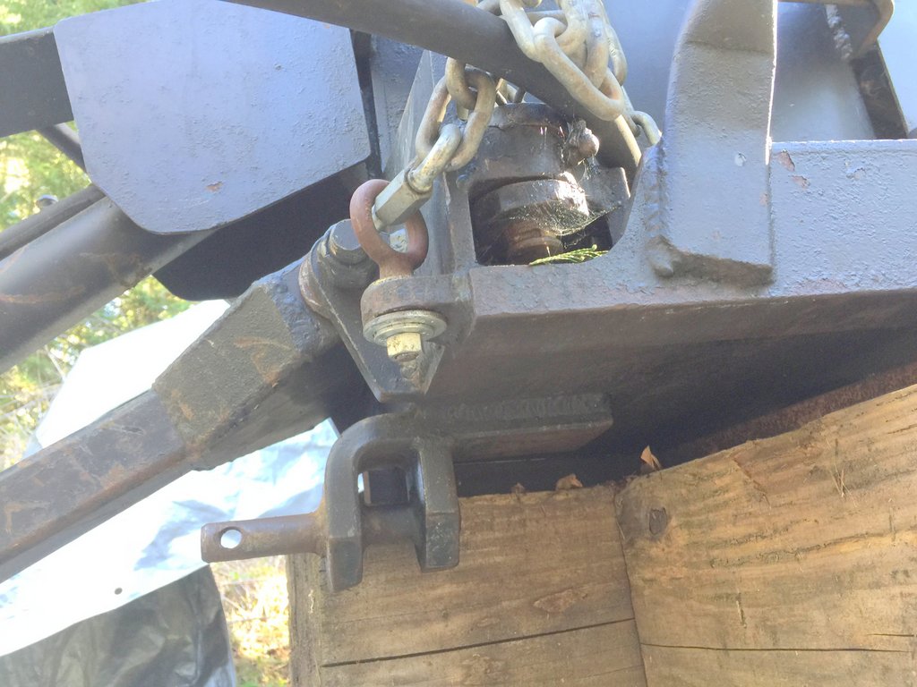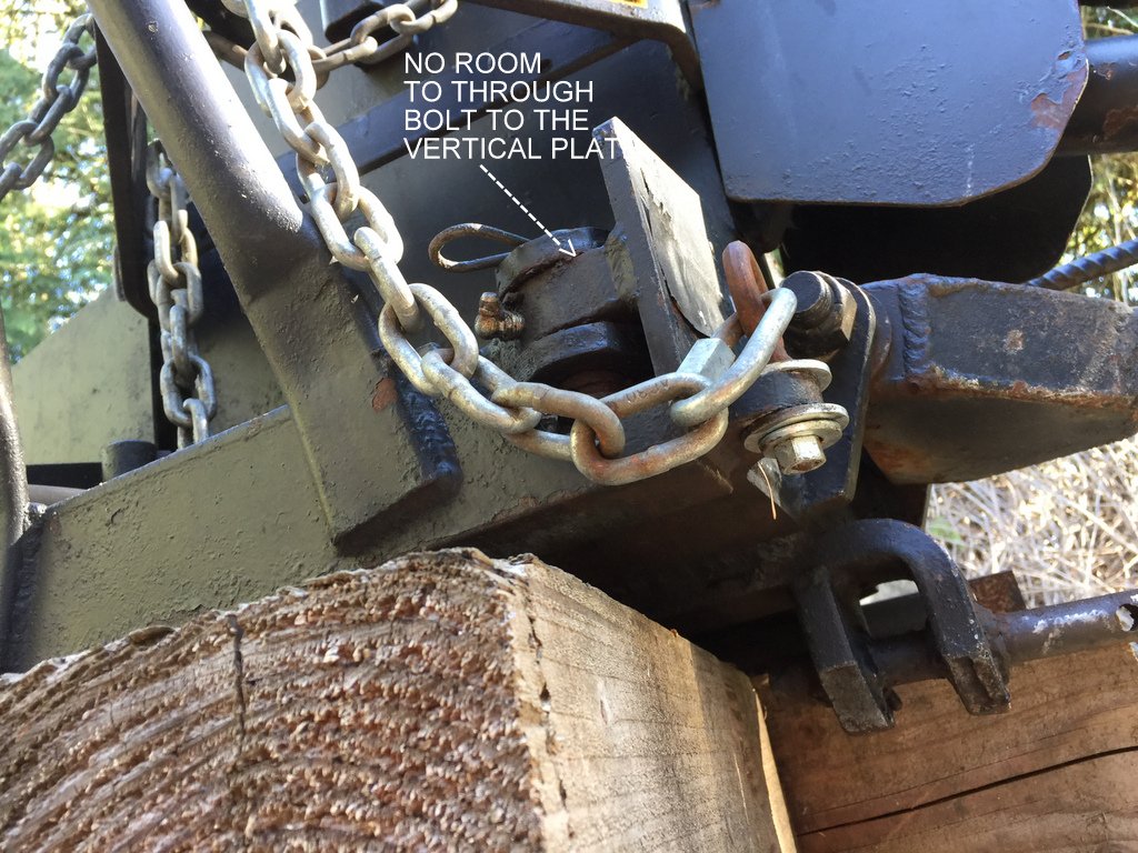 I infer I'll have to cutoff the lifting eyes, and perhaps the three point mounting pins as well. One concern I have is noted in one of the photos. It is that the hydraulic piston mounting bracket prevents through bolting the adapter to the vertical steel plate as is done on the Kioti backhoe.
