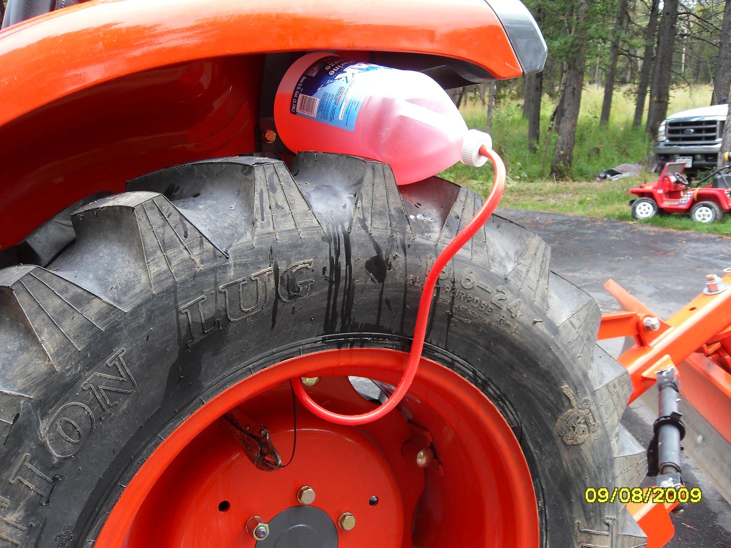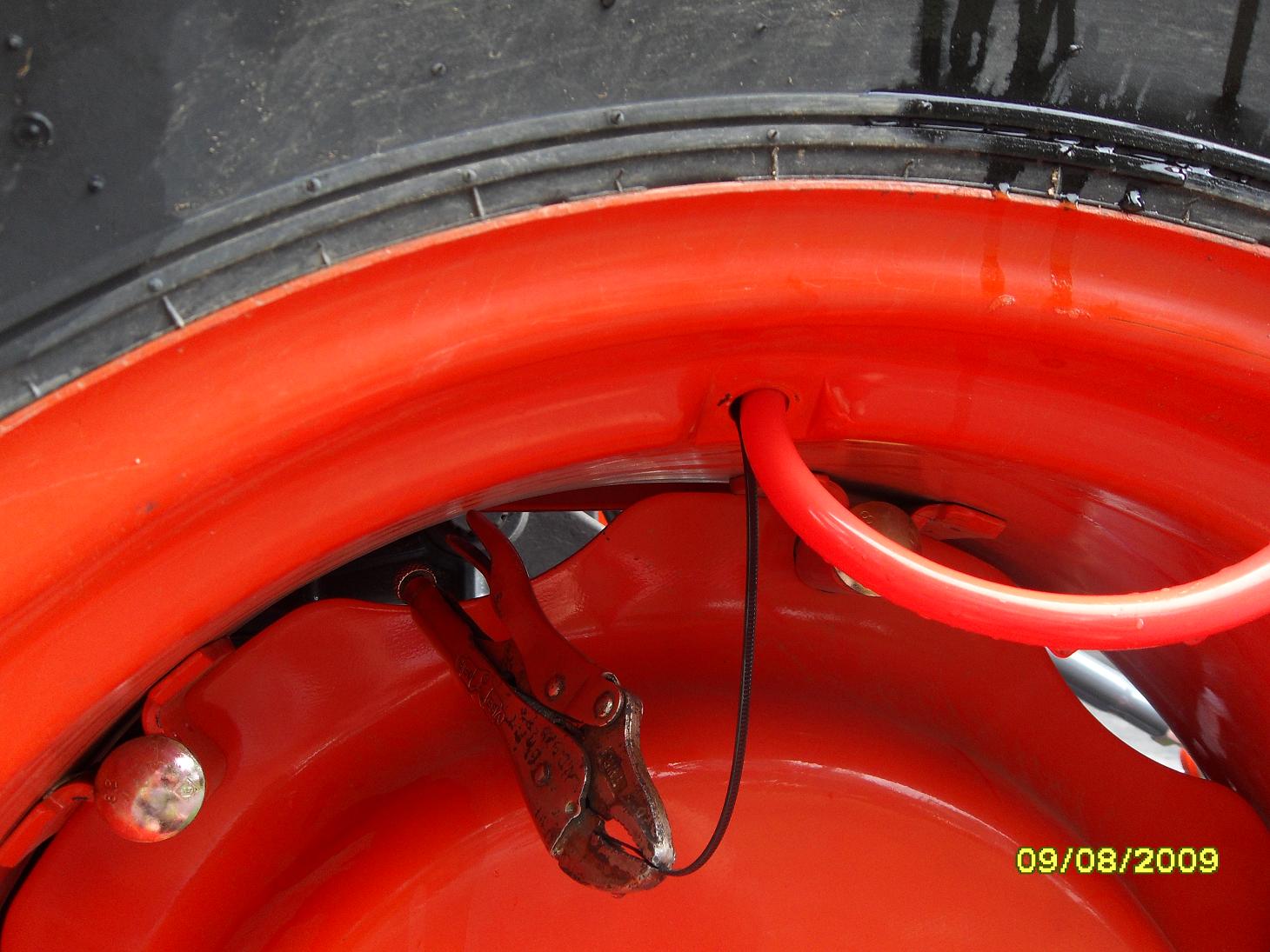 6: Filled the rest of the tire up with water from the hose, I used some clear tubing slid into the hose etc to get the diameter of the hose small enough to fit in the rim hole.