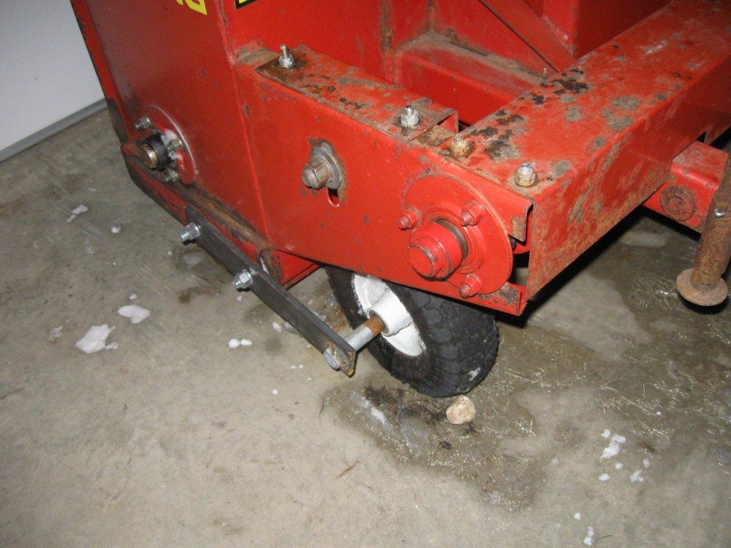Anyway, this fall I had welded on some skids, which turned out to be ineffective on our large, loose, rolly-polly rocks on the driveway. Tried tacking on a piece of pipe/tube Saturday to help keep from trenching with the skids, no dice. Cut the skids off Sat night and built these wheel holders to replace them. Tried it out on a couple drifts that formed Saturday night, and it seems pretty promising. Found a few lumps in the driveway big enough to be scalped and toss stones, but overall a success. May need to reinforce the RH bracket or add a "dual" tire that'd sit outside the cut (not crazy about that w/o adding a wing or something to widen out the cut) since that side is a little heavier and I had to offset the tire to fit between the auger chain and the frame...