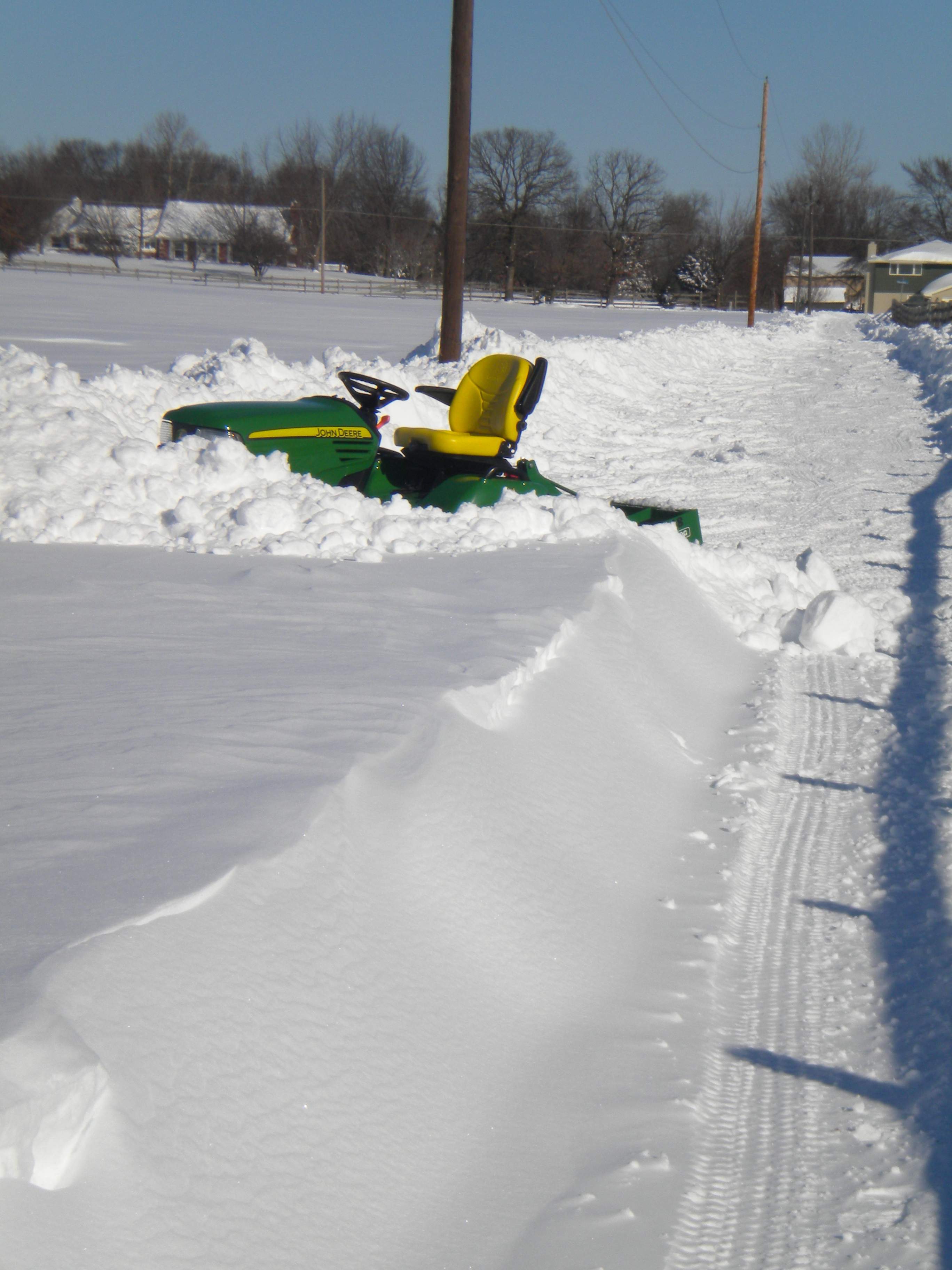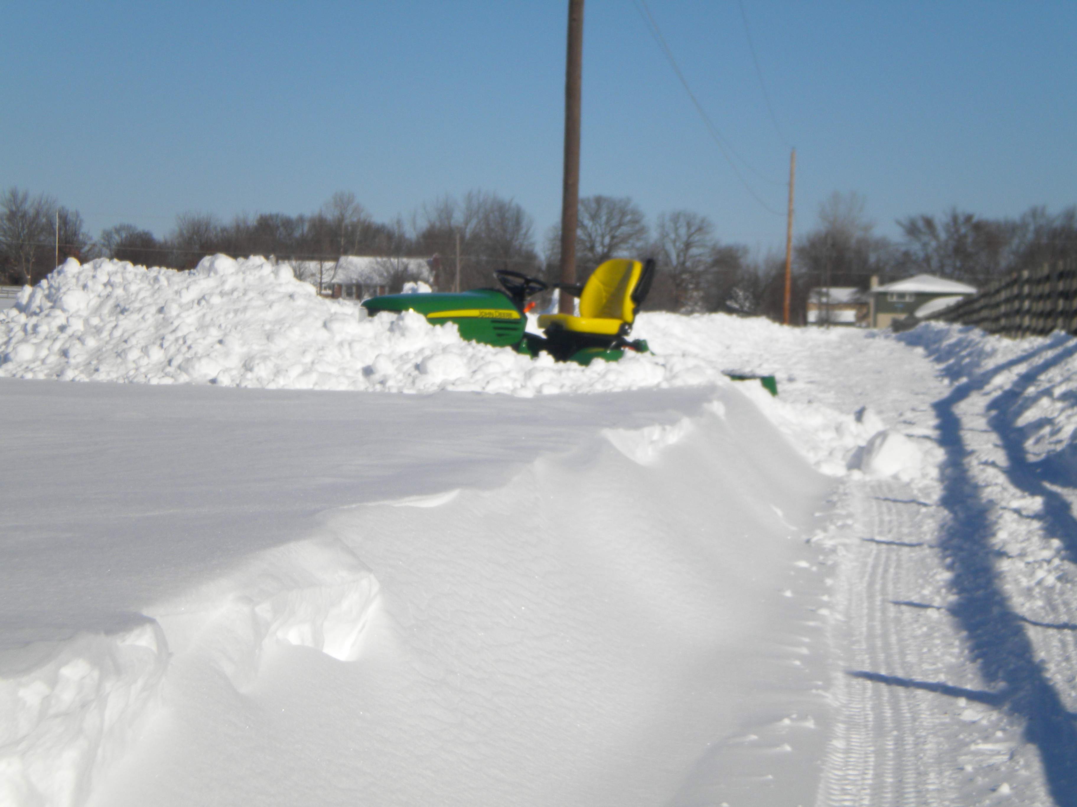 I see this thread is a year old, but since TBN decided to resurrect it, here's some pics from Feb 2011. I can make the lane drivable with two passes, up & back. When I get time I'll go out and push everything back if it's building up so I can still pull off the up & back thing in a pinch. The box blade was just left on out of laziness, but when I'm pushing stuff back it's kinda handy to push banks going either direction.