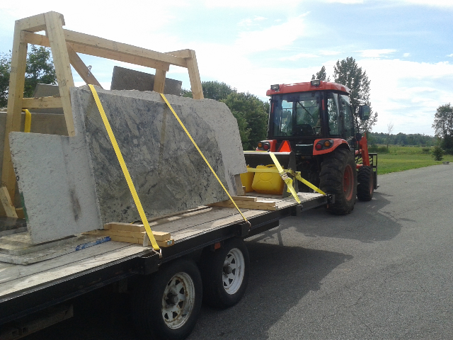 Since I had already taken the metal rack that held the granite, I left the rest of it on these 6 foot pallets that they had before I left with the first load. The pieces were smaller, so instead of putting each one in a sling, I just lifted the pallets level to the trailer deck and my dad (who met me there) and I just slid them on and stood them up.