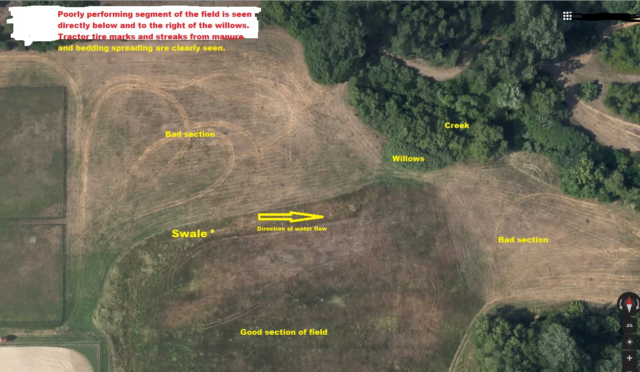 Here is a satellite image which may help explain the situation better. This satellite image was obtained in the fall of 2012. It was approximately 3 months after we had taken possession of the property and it shows the extent of the manure and pine shavings spread on the segments of the field in question probably during the spring of the year that we took possession of the property. To the south of the swale is the well performing segment of the hayfield. To the north and to the north east of the swale are the segments to which I am referring: