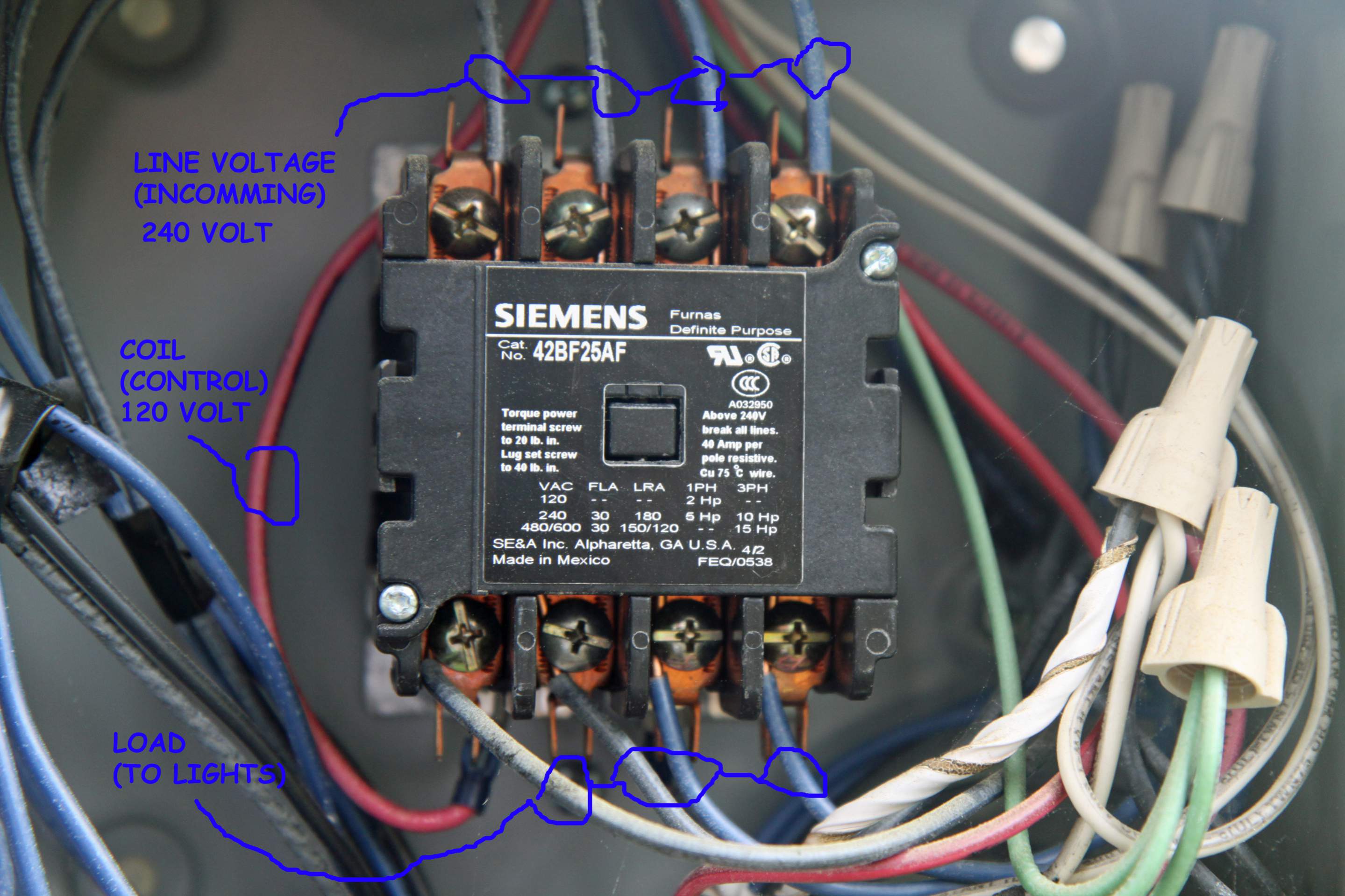 Heres a sample of one i did to control two separate 20 amp, 240 volt supply wires that ran 8 - 240 volt HID lights on an arena. All you have to do is flip a 110 volt coil switch and you control 2 separately derived 240 volt systems. Real easy and real cheap to do.