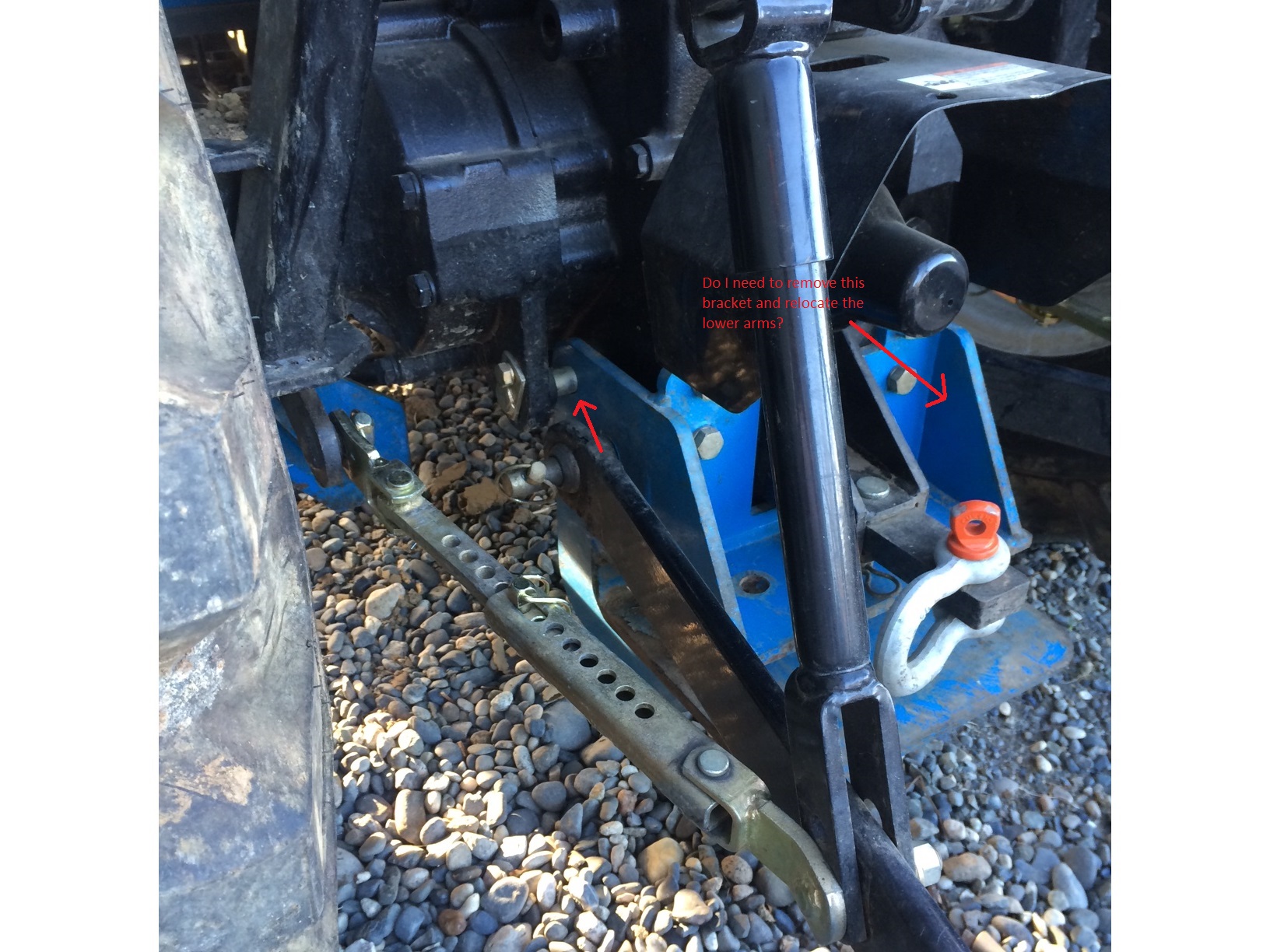 I've attached a couple pics to show what I'm looking at. Am I supposed to remove the center back-hoe bracket (in blue) and re-locate where the lower arms attach to the tractor? It seems strange that the bracket has pins for the arms, but they don't really seem to work as it should. Am I missing an adjustment?