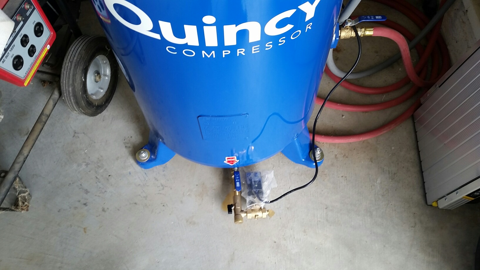 I called Quincy for a recommendation for an electric condensate valve. I ordered it, and got it put on this week. I set the timers for a 4 second spritz every 45 minutes. The tank is 4' away from the overhead door so to try to keep the timer clean, I put a plastic bag around it and loosely taped it so the wind wouldn't blow it off.