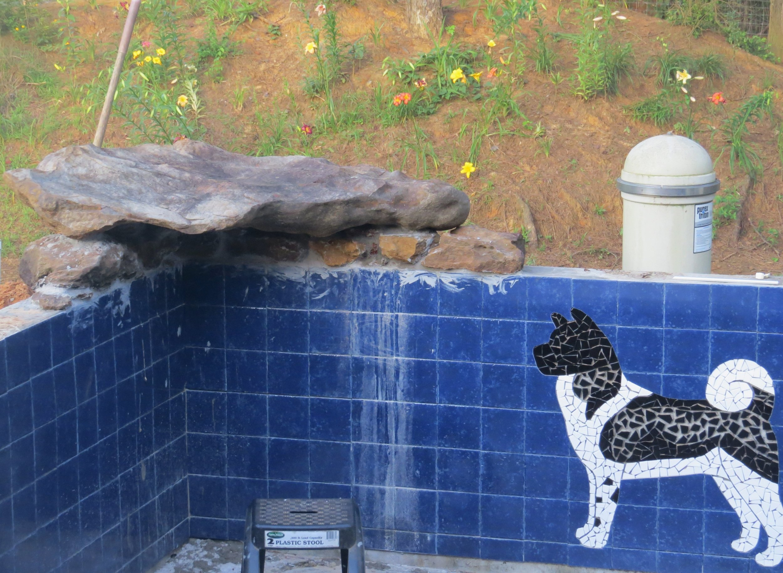 My original plan of using rock to create the Akita ran into a problem when I found out that the only really bright white stone out there is marble. The problem with marble is that it deteriorates over time when under water. Then the only super black stone that I could find wasn't cut. It was full sized, rounded, rocks. I thought about going with rocks, but really wanted a flat finish. I spoke to my tile supplier at The Tile Shop here in Tyler, and he suggested a porcelain tile that was dense enough for using in a pool. Most tile isn't very dense, so it's not a good choice for pools. Regular pool tile doesn't come in the solid colors that I wanted for the Akita, so my options became very limited.