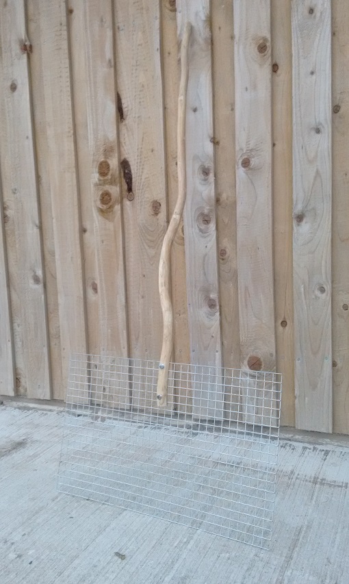 Next time I cut off the biggest piece of weld mesh I thought I could reasonably manage by hand. I was looking around for a handle when I remembered an ash felled a few months earlier that was still waiting to be cut for firewood. A straight ish length from it did the job, the slight kink making a good hand hold. Bolted together, it made what looked like a huge fly swatter.