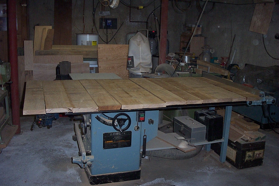 I went to the sawmill and got a bunch of 5/4 rough sawn oak today. I rough cut the planks to give me enough stock for the top, and allowing for milling waste to finish to size. What I did forget, was to get enough stock for two leaves :confused: I will have to take another run over there.