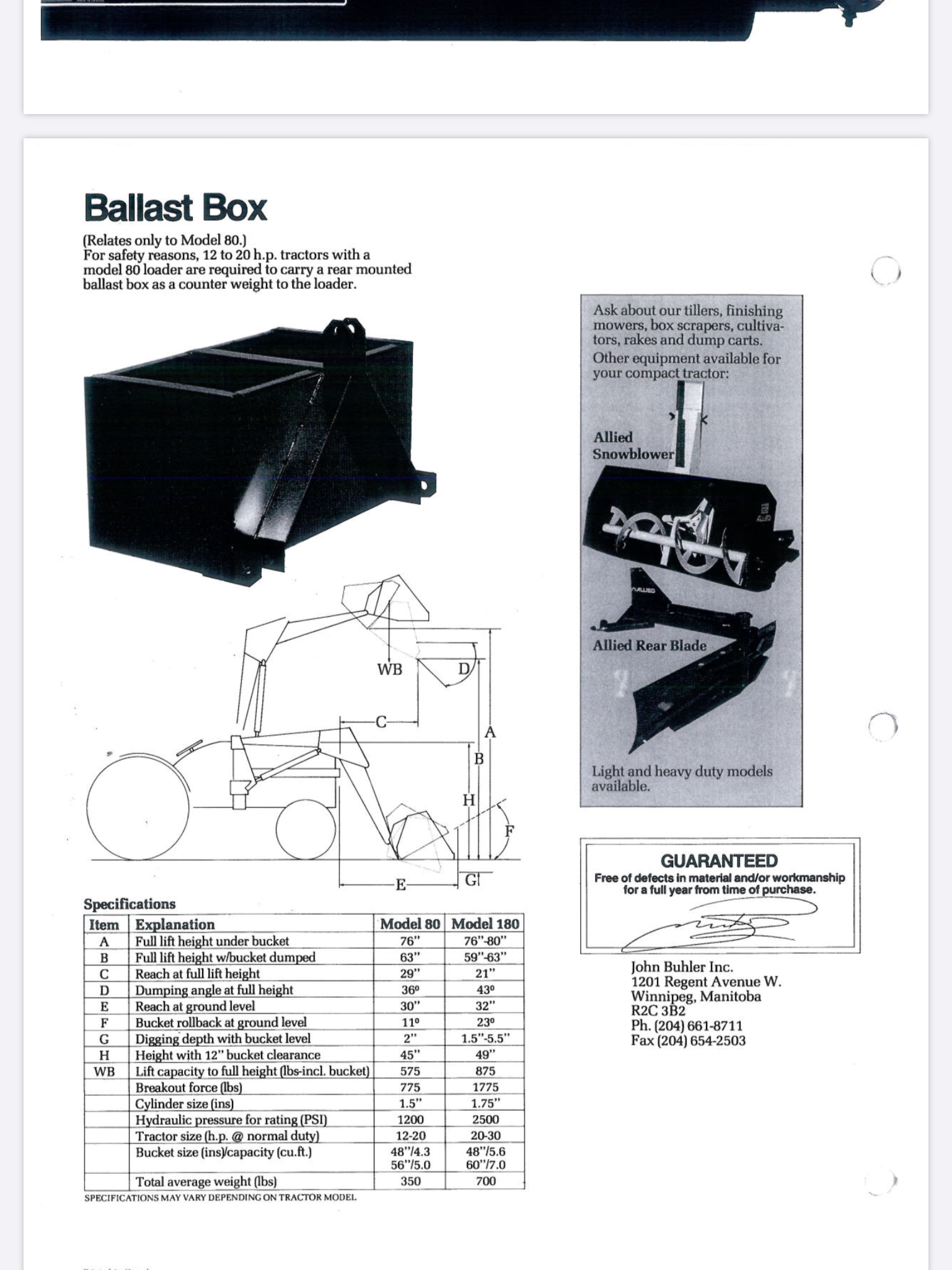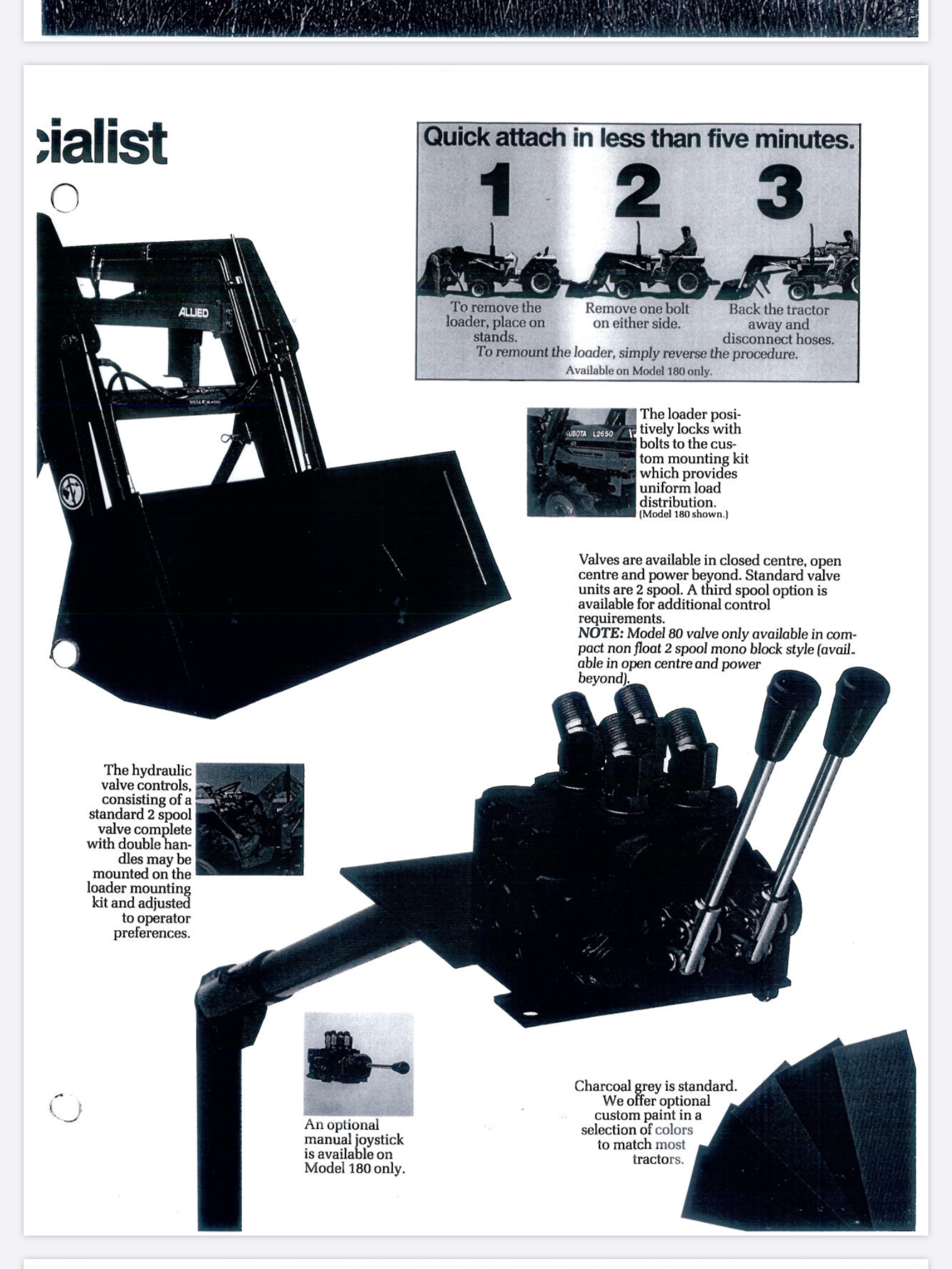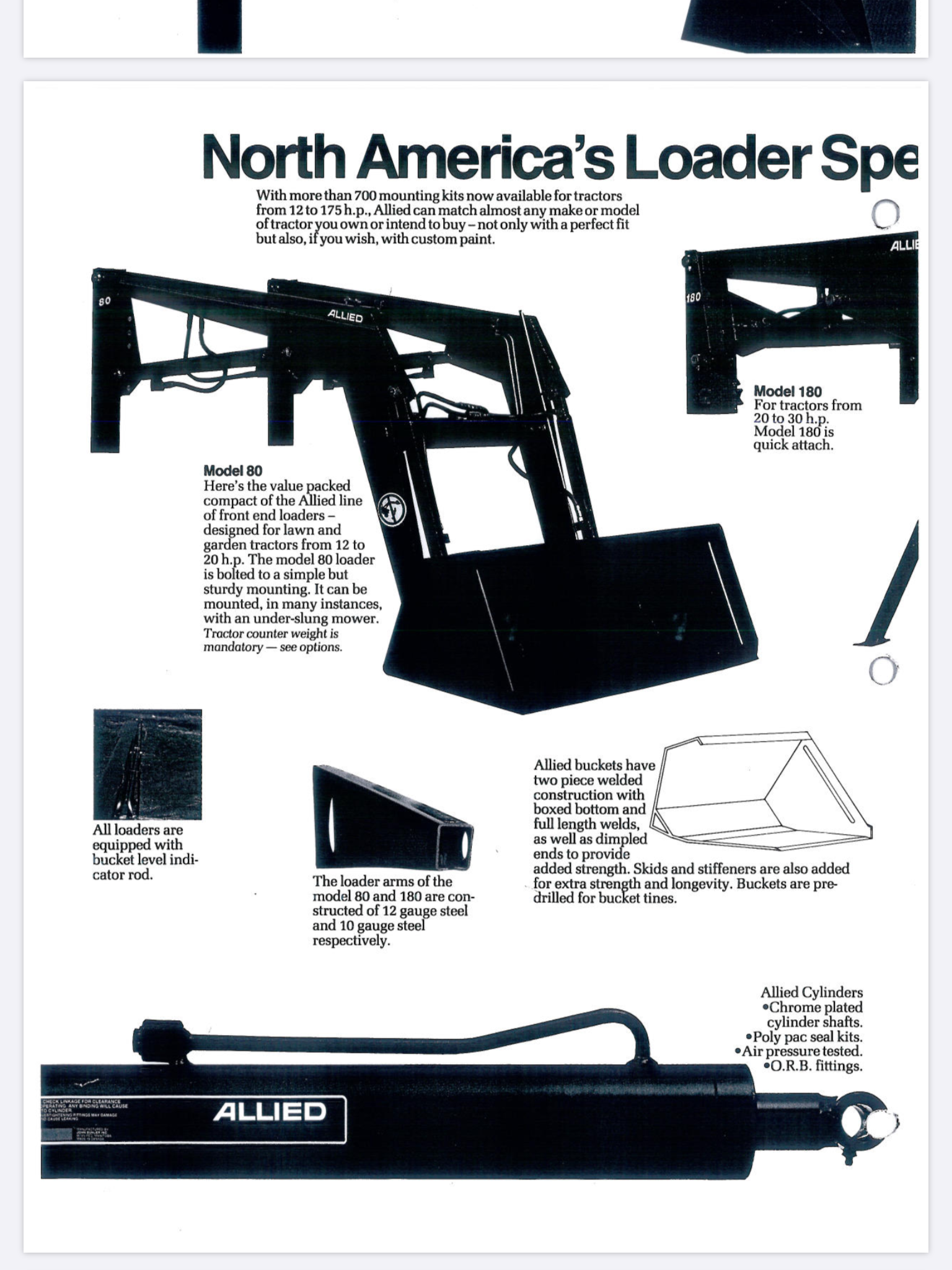 I know this thread is 3 years old, but I just acquired an Allied 180 loader to put on my John Deere 755 tractor. I contacted Allied via a Farm King dealer, and I got a prompt response and an emailed copy of the old 180 sales brochure. It’s got the specs, and I thought posting it here might someday help someone else out. I have to say I am impressed by the customer service of the farm king/allied network. -Chris