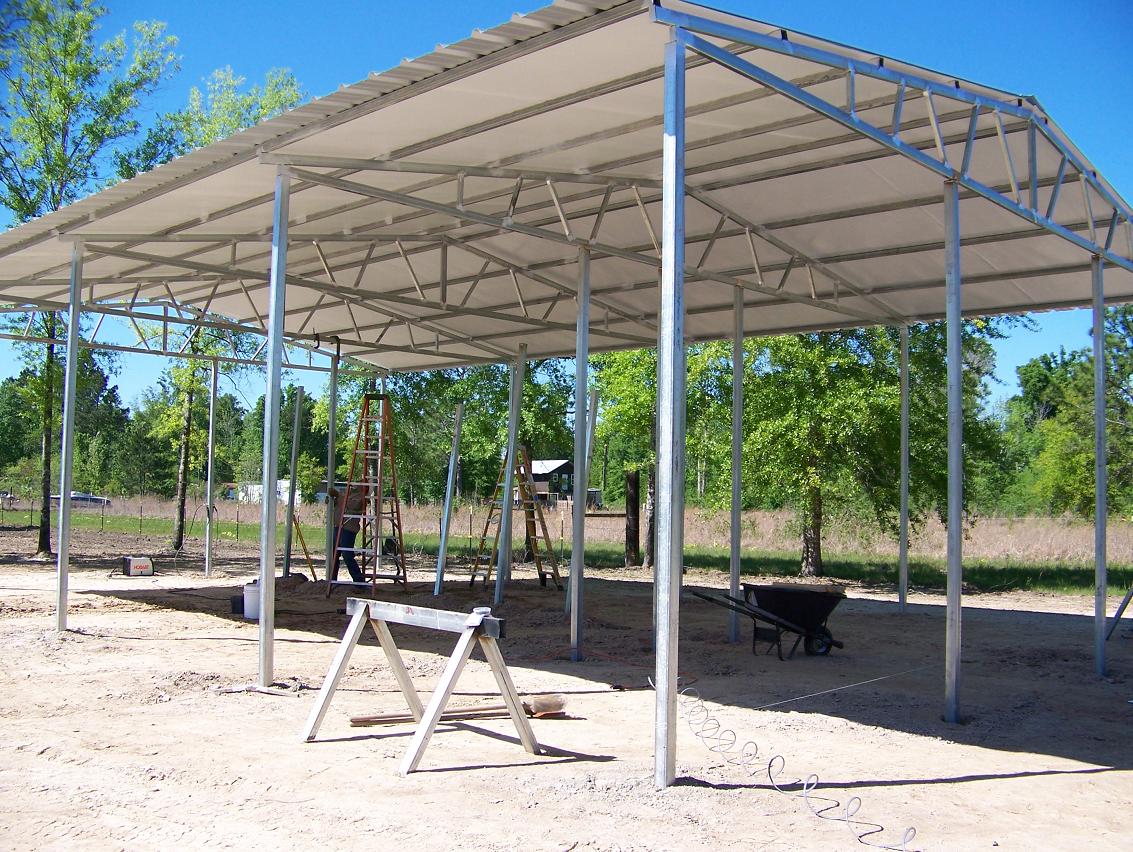 We built this back in the spring and still have a couple things to finish up. The structure is all galvanized tubing. I had a crew put up the outside poles, trusses, and the rest of the roof. The total dimensions are 30'x48'. I have 3 12'x12' stalls, a 12'x14' tack room with 8' ceiling, a loft on top of that, and 12'x16 area for hay storage, there is also a 18'x36' open area in front of the stalls. I had another crew finish the concrete. Everything else was done with the help of a few family members.